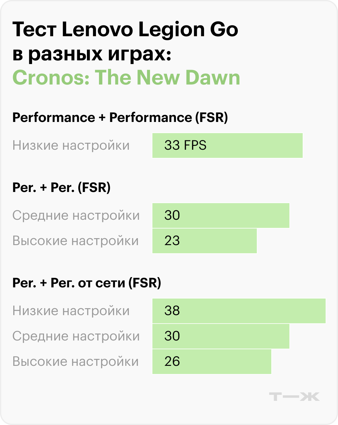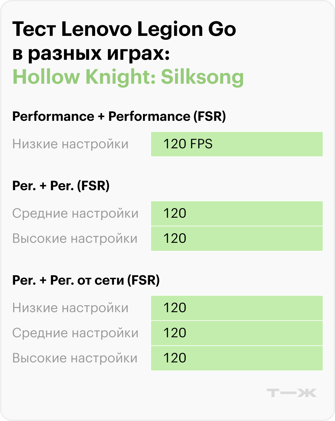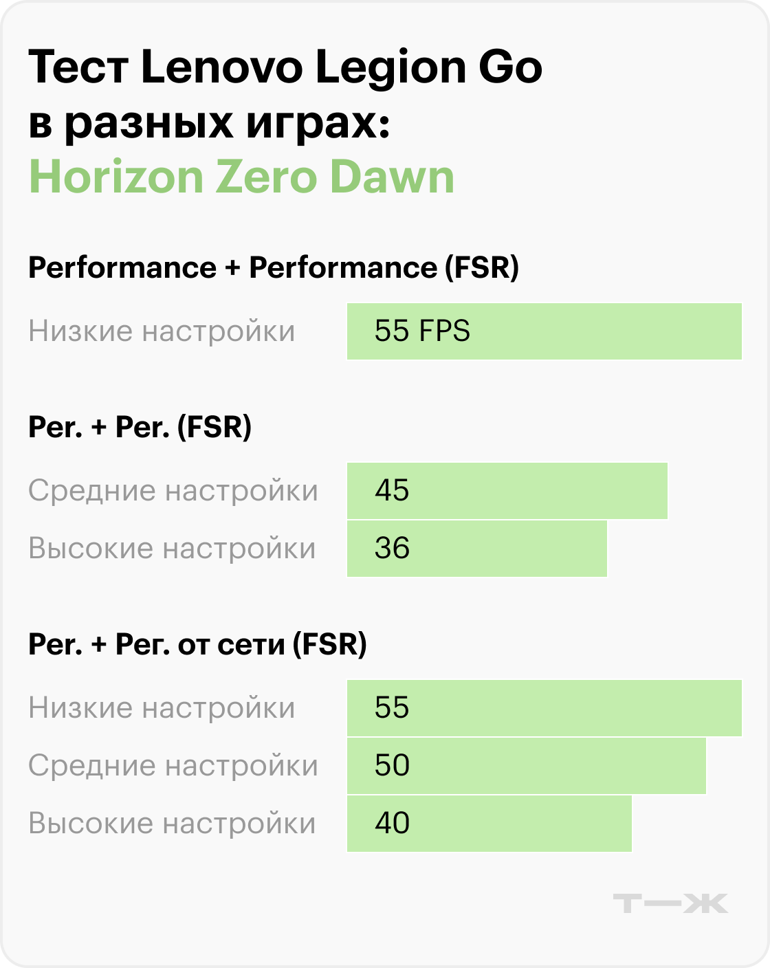 Судя по результатам тестов в актуальных и требовательных играх, производительность Legion Go во многом зависит от разрешения, настроек графики и использования технологий масштабирования.