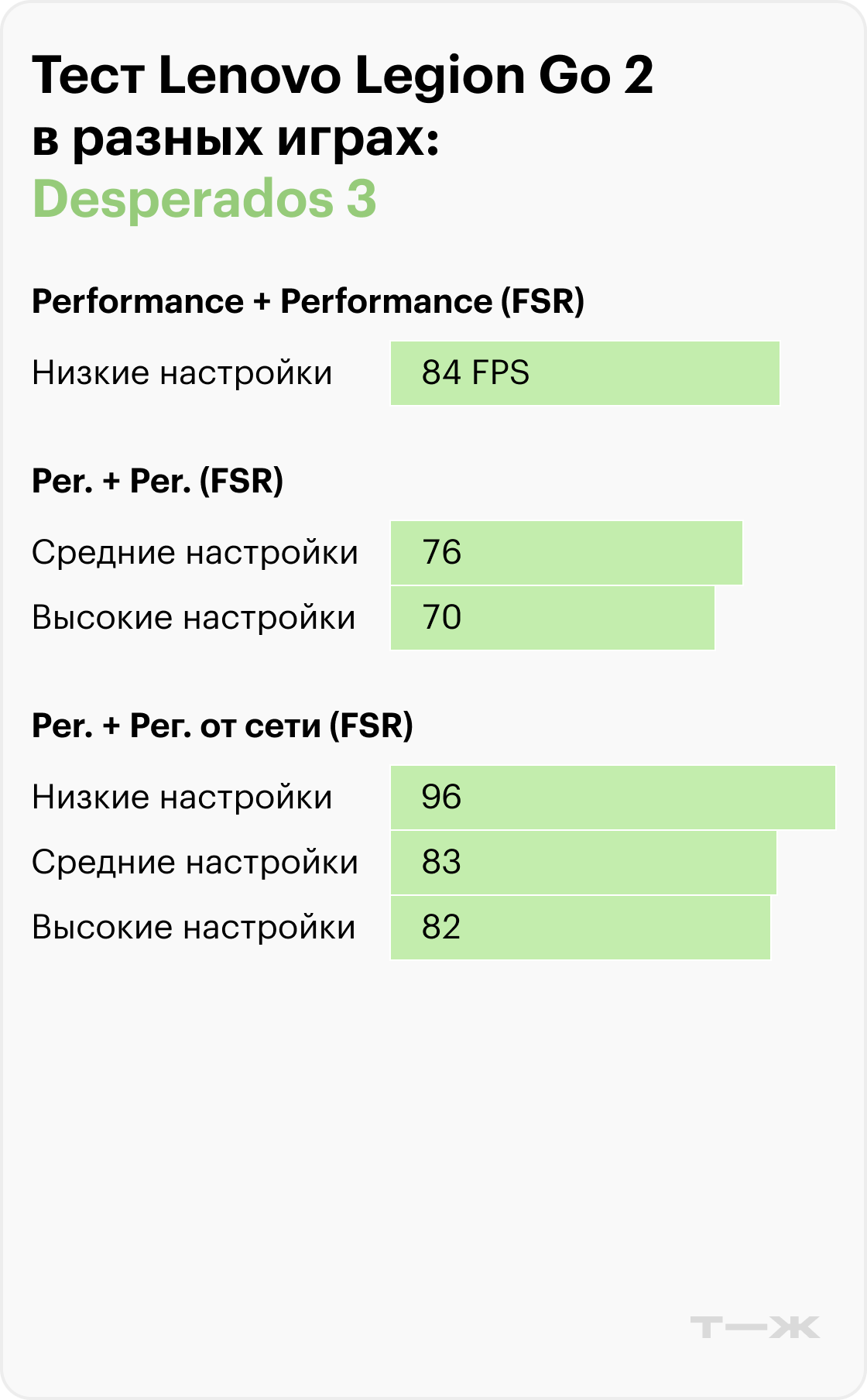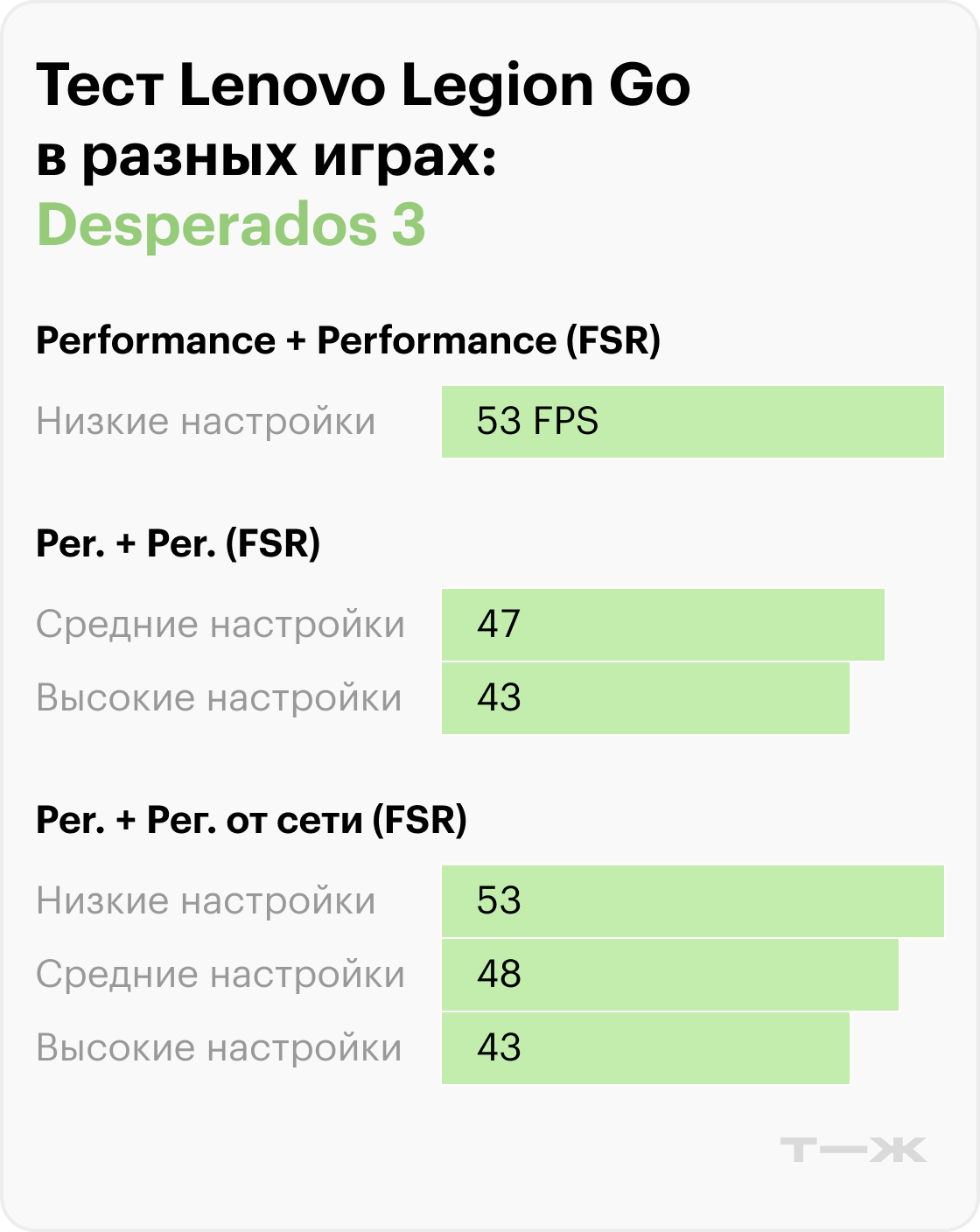 Менее требовательные проекты работают заметно лучше. В Hollow Knight: Silksong консоль даже в минимальном режиме энергопотребления выдает 97—144 FPS. В Desperados 3 при родном разрешении 2 560 × 1 600 частота кадров держится на уровне 43—53 FPS независимо от настроек графики, а при снижении разрешения до 1 920 × 1 200 производительность возрастает примерно на 20 FPS.