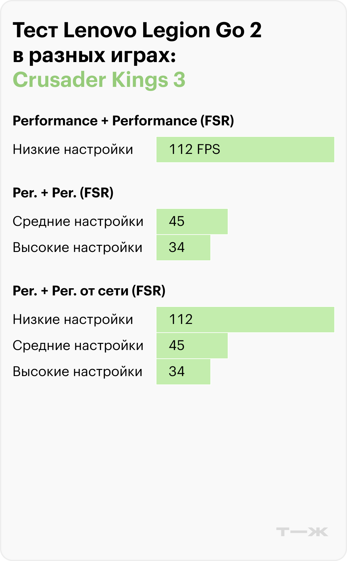 В Crusader Kings 3 при высоком качестве графики Legion Go 2 выдает около 34 FPS. На средних настройках частота кадров колеблется в диапазоне 45—116 FPS, а на низких достигает пределов частоты обновления дисплея — 112—144 FPS. Как и у предыдущей модели, режим вертикальной мыши на съемном контроллере заметно упрощает управление в стратегических играх.