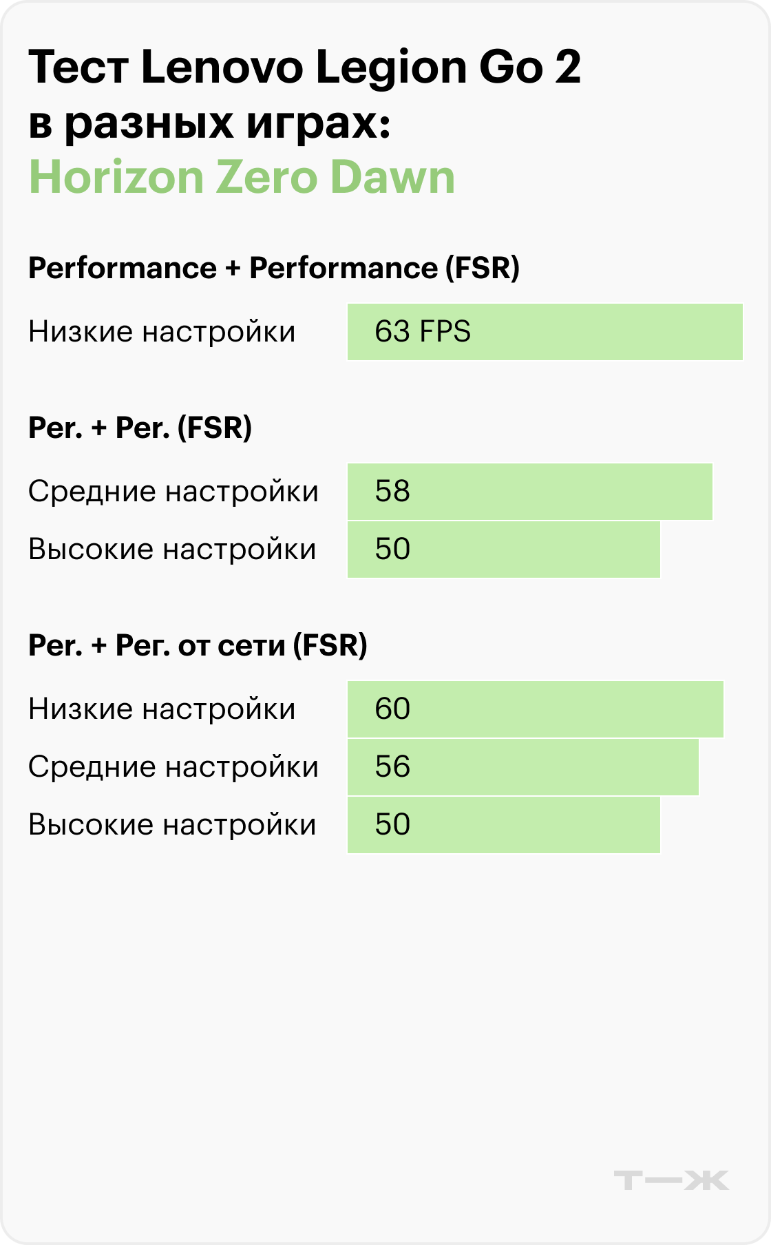 В Horizon Zero Dawn с FSR в режиме баланса Legion Go 2 показывает 43—52 FPS на высоких настройках, 50—58 FPS на средних и 60—63 FPS на низких. При подключении к питанию результаты немного выравниваются и достигают 46—62 FPS. Как и у предыдущей модели, использование FSR в режиме качества приводит к падению производительности примерно на 10 FPS, поэтому оптимальным выбором остаются режимы баланса или производительности.