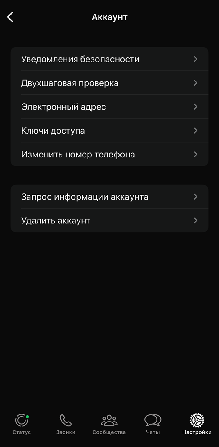 Вот как указать почту в WhatsApp*: «Настройки» → «Аккаунт» → «Электронный адрес» → указать почту → «Далее» → ввести код из почты → «Подтвердить». Пункты для iOS и Android могут немного различаться. Важно проверить, что приложение обновлено. В старой версии может не быть нужного пункта меню.