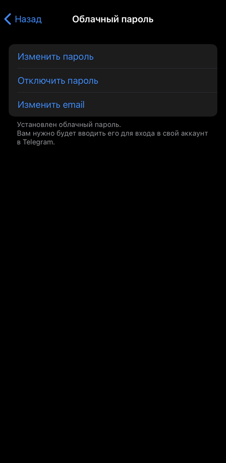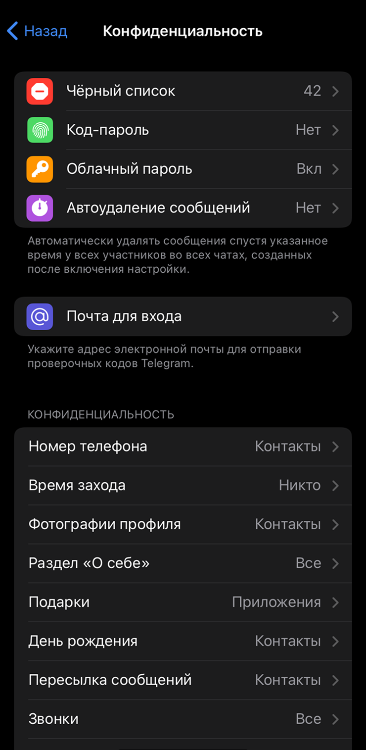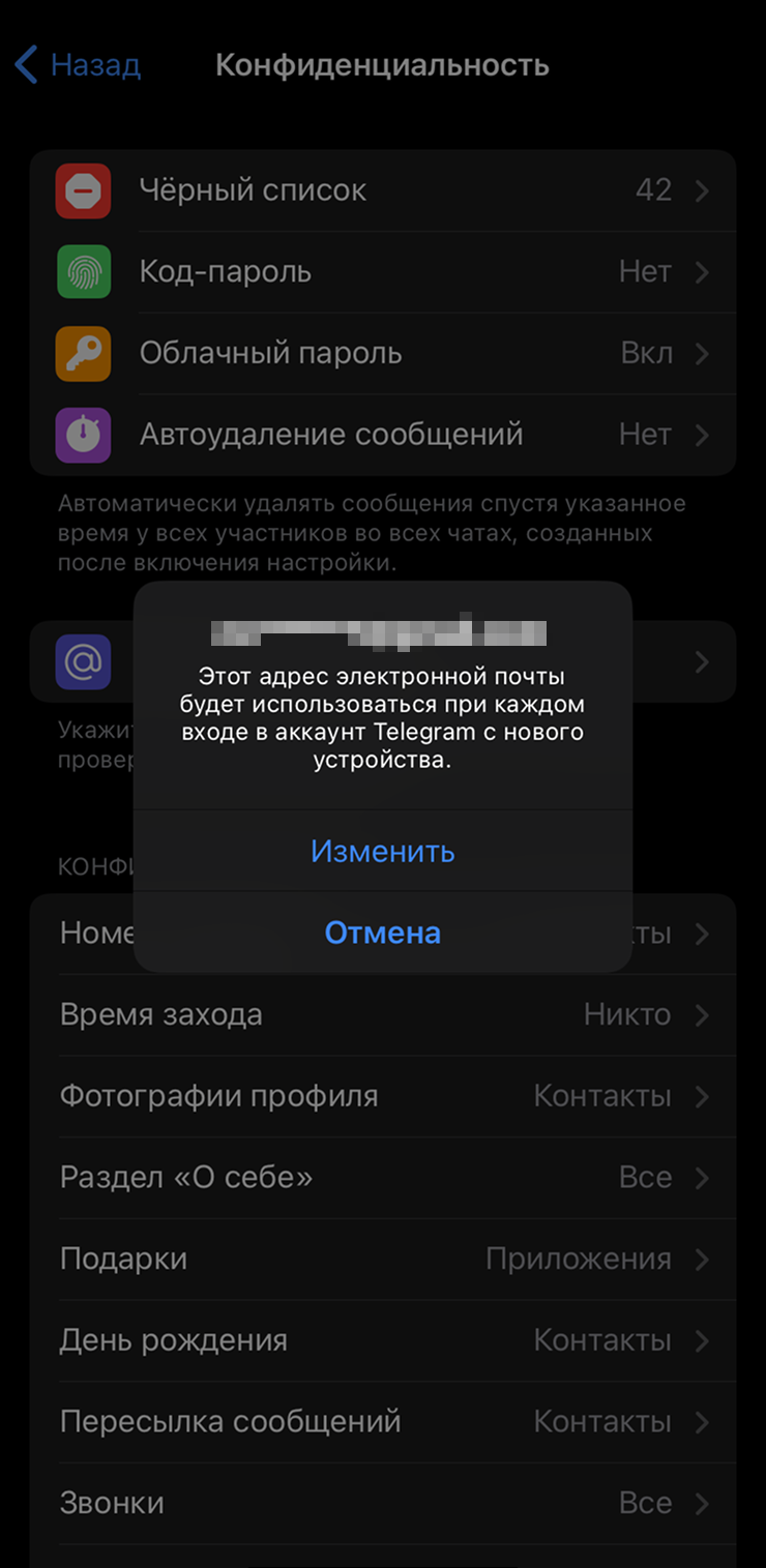 Если в настройках конфиденциальности нет пункта про почту, надо проверить облачный пароль. Это работает так: «Настройки» → «Конфиденциальность» → «Облачный пароль» → «Изменить email» → указать почту → «Далее» → ввести код из почты.