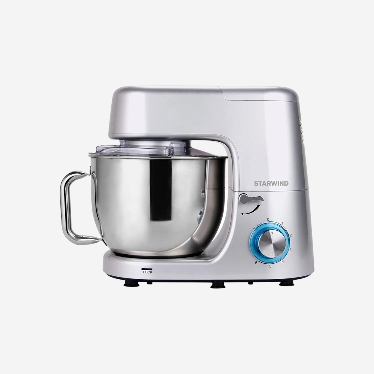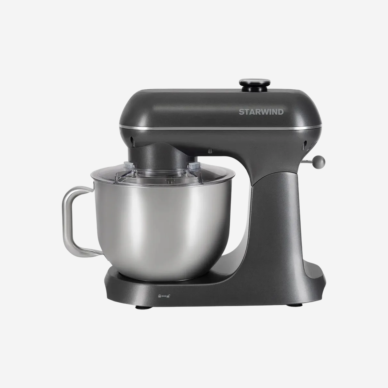 Корпус не полностью металлический, прибор легкий — 5,5 кг. По габаритам компактный — 30 × 17 × 28 см. Такой агрегат не обязательно держать на одном месте, можно убирать его в шкаф за ненадобностью. Во время работы удерживается на поверхности присосками. Из плюсов — металлические шестерни редуктора. Шестеренки бюджетных устройств часто делают из пластика, а у всей линейки Starwind шестерни металлические. Такой миксер прослужит долго.
