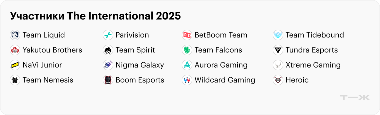 Всего в Гамбург приедут 16 лучших команд мира — восемь из них Valve пригласила по результатам сезона-2024/25, остальные прошли через региональные онлайн-квалификации. Gaimin Gladiators из-за проблем с составом снялись с турнира — вместо них прямой инвайт получил китайский клуб Yakutou Brothers.