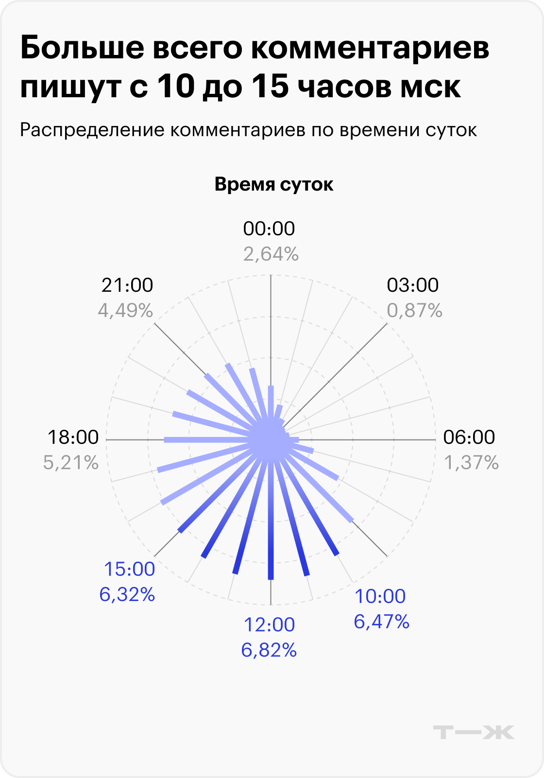 Реже всего комментарии появляются в 4 утра по Москве. Их могут писать как неспящие пользователи из Москвы и Петербурга, так и жители Дальнего Востока, у которых в этот момент как раз наступает 11 утра по местному времени.