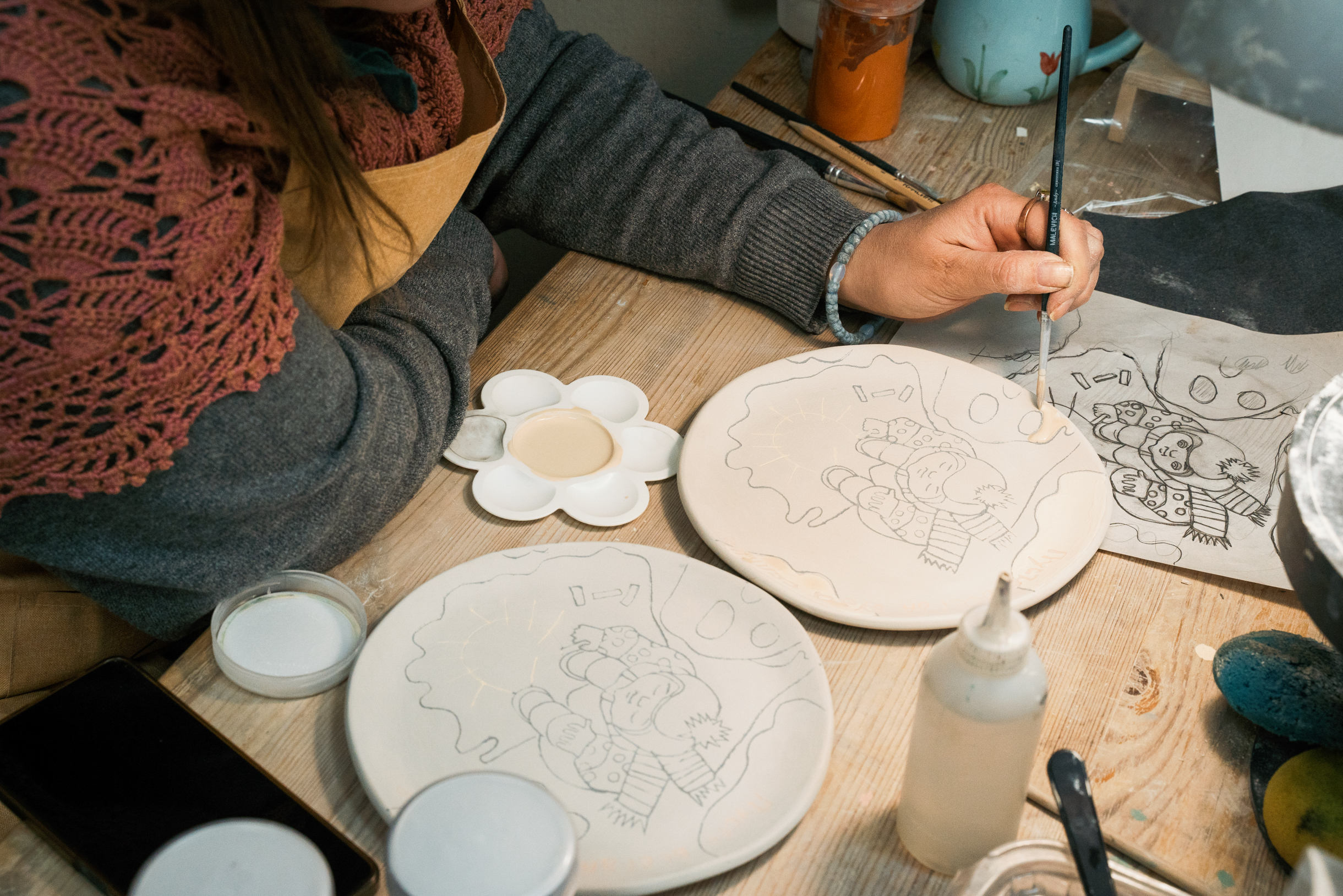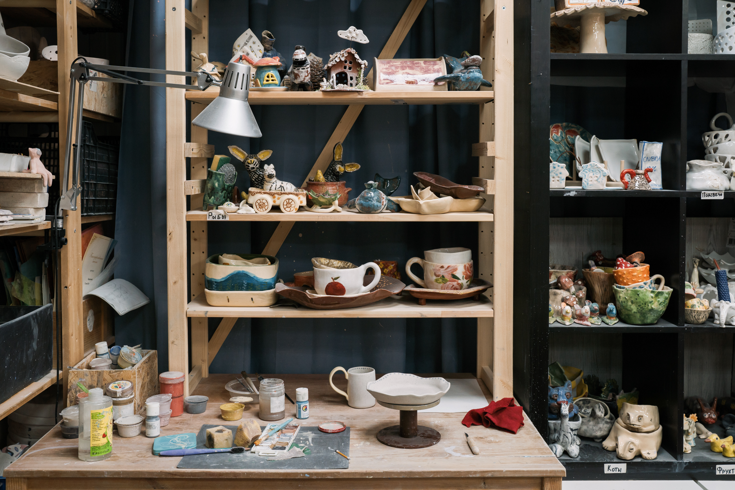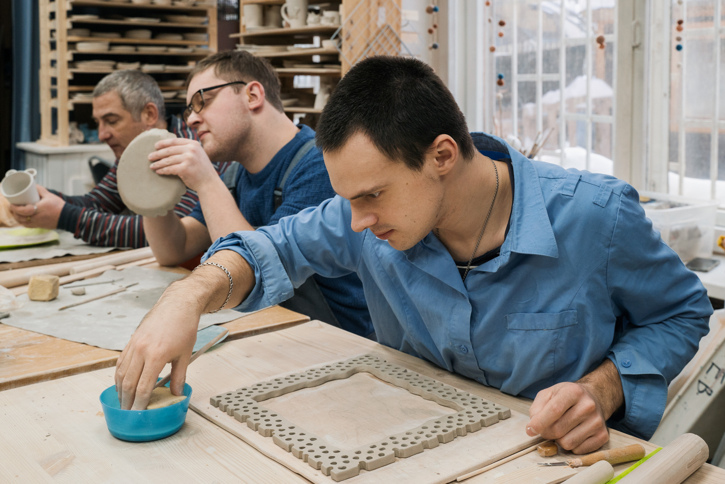 Мастерская на проспекте Вернадского, по моим оценкам, — самое крупное социальное керамическое производство в России. Изделия изготавливаем как литьем, так и вручную. Еще здесь есть столярная мастерская и арт-студия, где проводим занятия по рисованию. Лучшие работы переносим на изделия или печатаем на ткани.