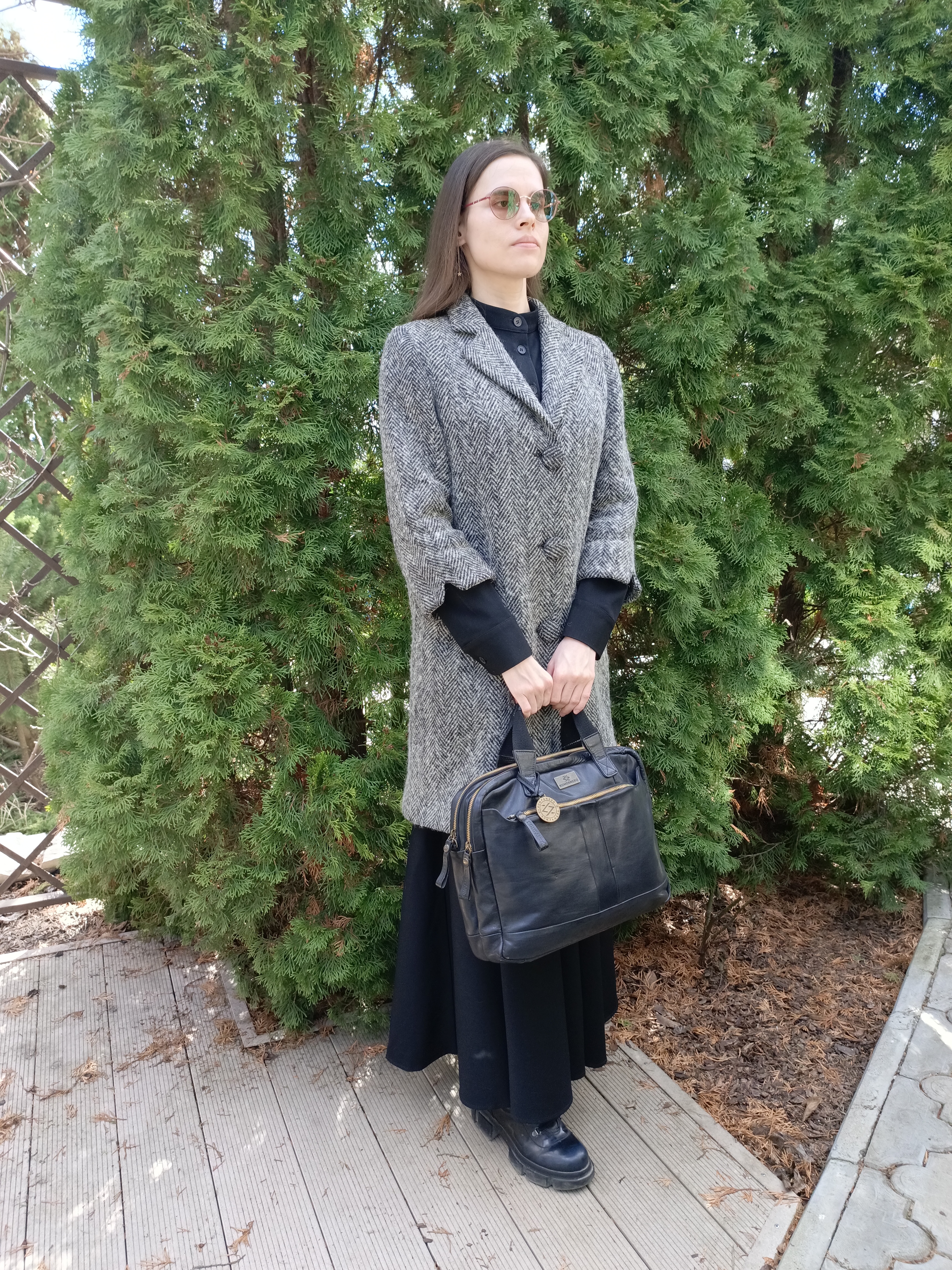 Я ношу свое платье реже, чем хотелось бы, — тогда, когда нет риска забрызгать подол грязью. По иронии судьбы оно рассчитано именно на зиму и межсезонье. Мне нравится простое и элегантное сочетание для прохладной весны/осени: черное платье плюс серое пальто в елочку. Так я хожу на учебу. Фотографии к статье были сделаны перед вечерней парой по философии.