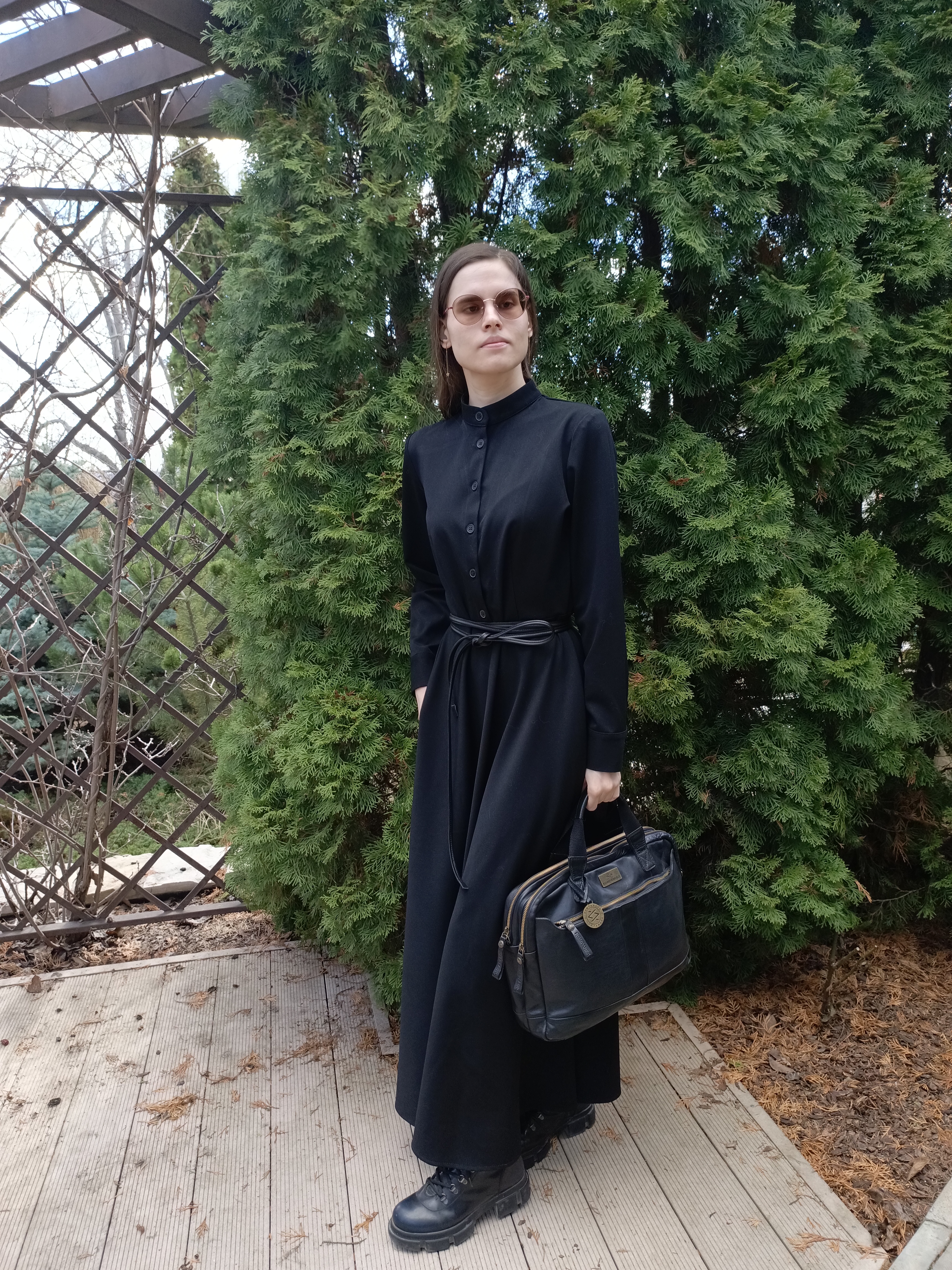 Около семи лет назад я поняла, что не смогу спокойно жить без длинного платья с воротником-стойкой, желательно черного. Найти его оказалось заданием со звездочкой. Я подолгу рассматривала витрины магазинов и изучала каталоги маркетплейсов, но всё, что они предлагали, так или иначе меня разочаровывало. Слишком коротко. Слишком откровенно. Перегружено лишними деталями. Из дешевого материала. Только в прошлом году я подобрала идеальную модель — шерстяное платье-рубашку от российского бренда po Pogode.