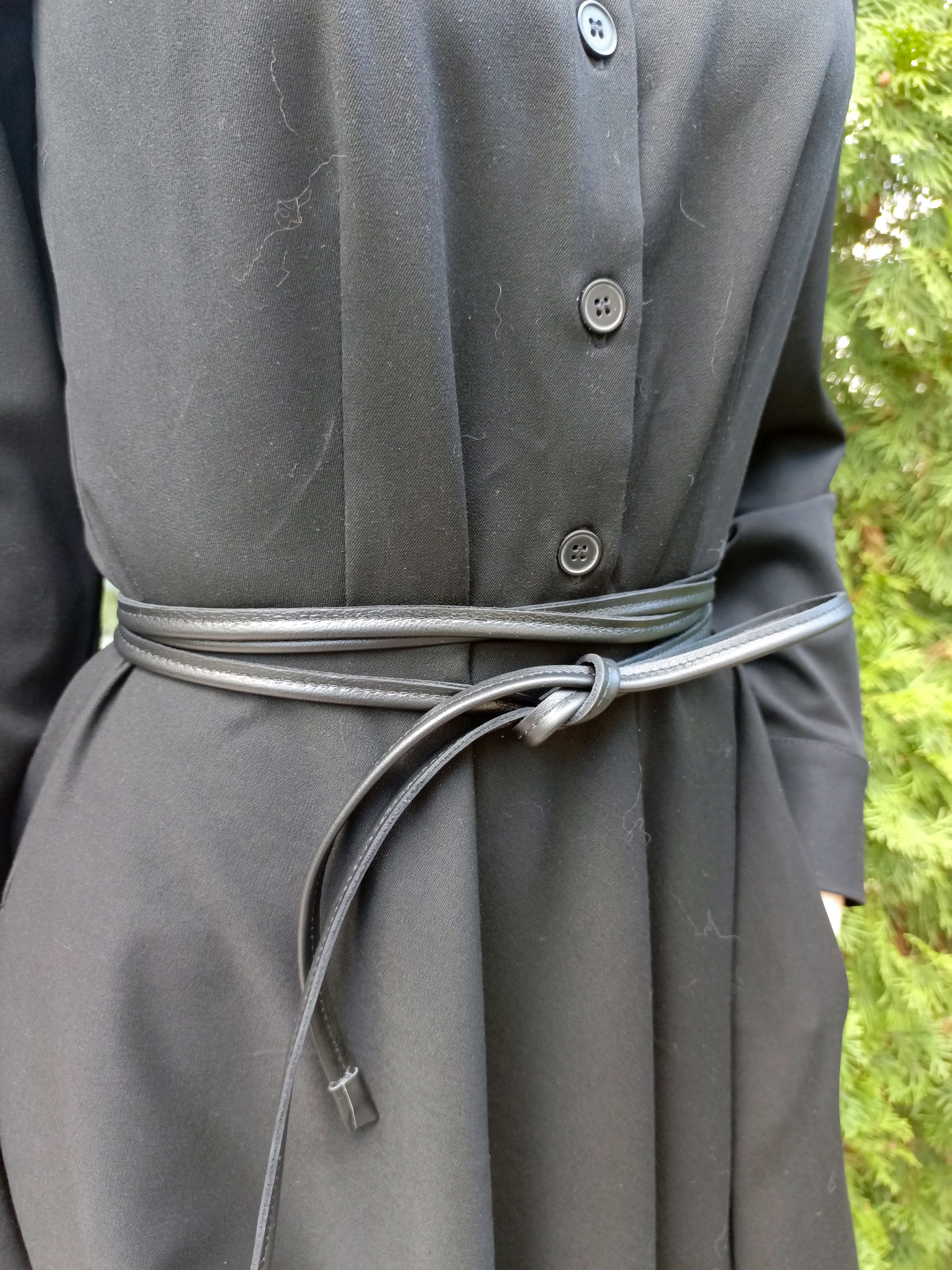 Думаю, потенциал платья еще предстоит раскрыть. В нем можно выглядеть и культурно, и субкультурно; всё зависит от макияжа и аксессуаров. Единственная деталь, которая переходит из одного образа в другой, — кожаный шнурок от отечественного бренда ANTQ. Я завязываю этот пояс небрежным узлом на талии, чтобы очертания фигуры стали более четкими.