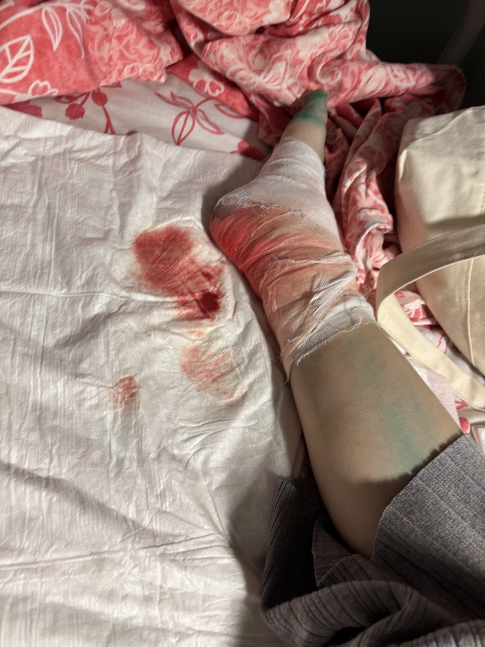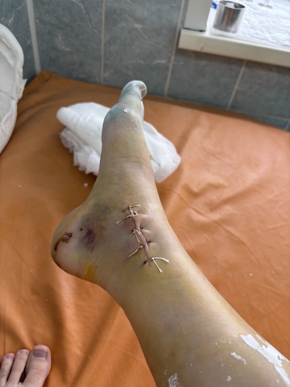 На месте мне наложили шину и установили катетер для введения обезболивающего. Тогда боли еще не было и я не осознавала масштаб травмы. Меня переложили на каталку, погрузили в скорую и мы поехали.