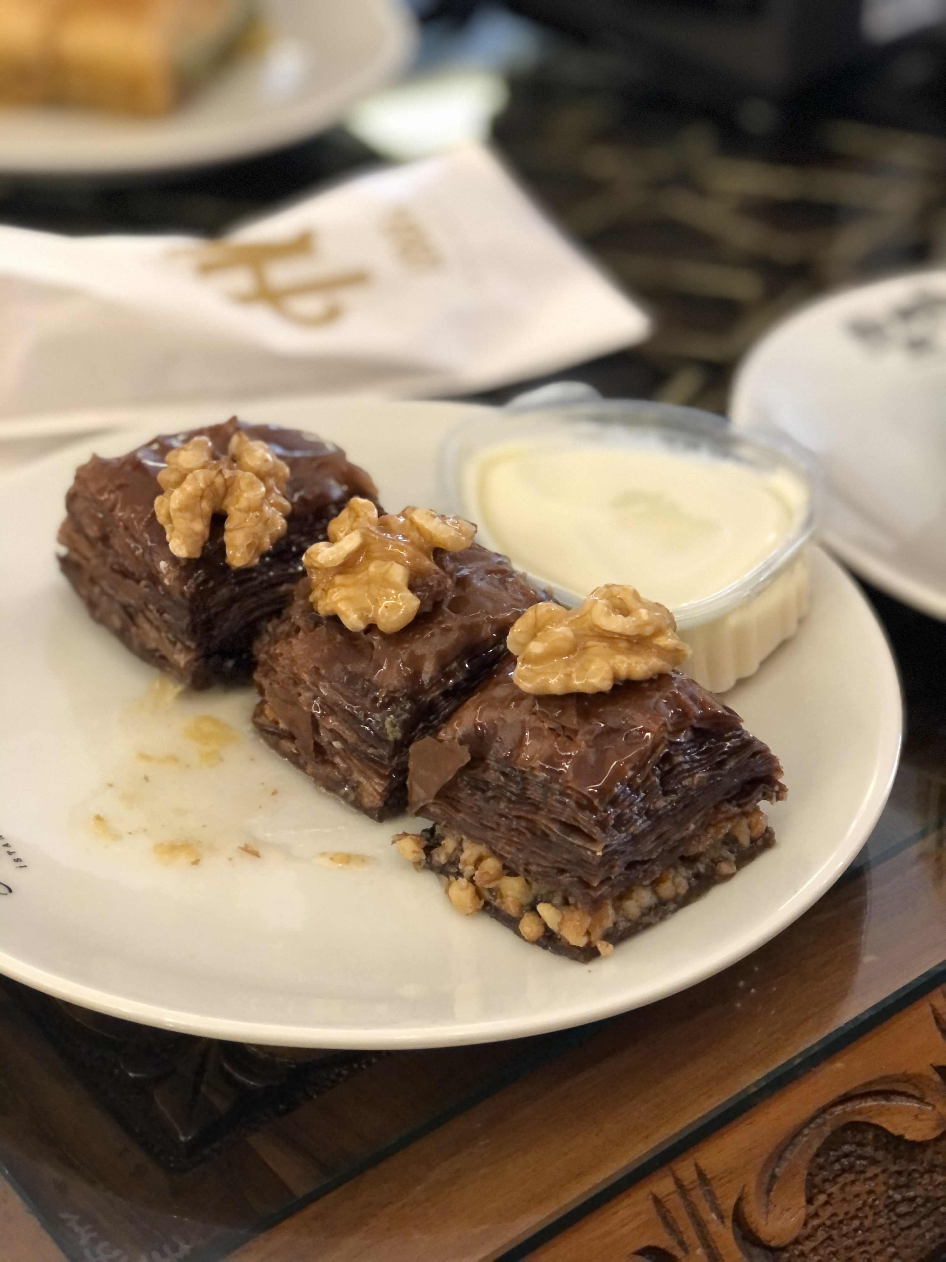 Баклава. Или пахлава. Сразу развею миф. Медовой пахлавы не существует, забудьте. Сладость готовится с сахарным сиропом. В Турции существует невероятное количество разновидностей: с фисташками, с фундуком, с грецким орехом, треугольная, квадратная, в форме рулетиков… Моя любимая — трендовая холодная пахлава или soğuk baklava. Вместо сиропа ее пропитывают кремом, похожим на расстаявший пломбир. Получается очень нежный и довольно легкий десерт.