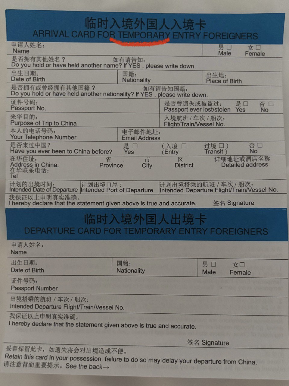 Анкеты, которые раздают в самолете, для пребывающих в Китай заполнять не нужно. Только анкету как на фото. Взять ее можно на специальных стоках в аэропорту