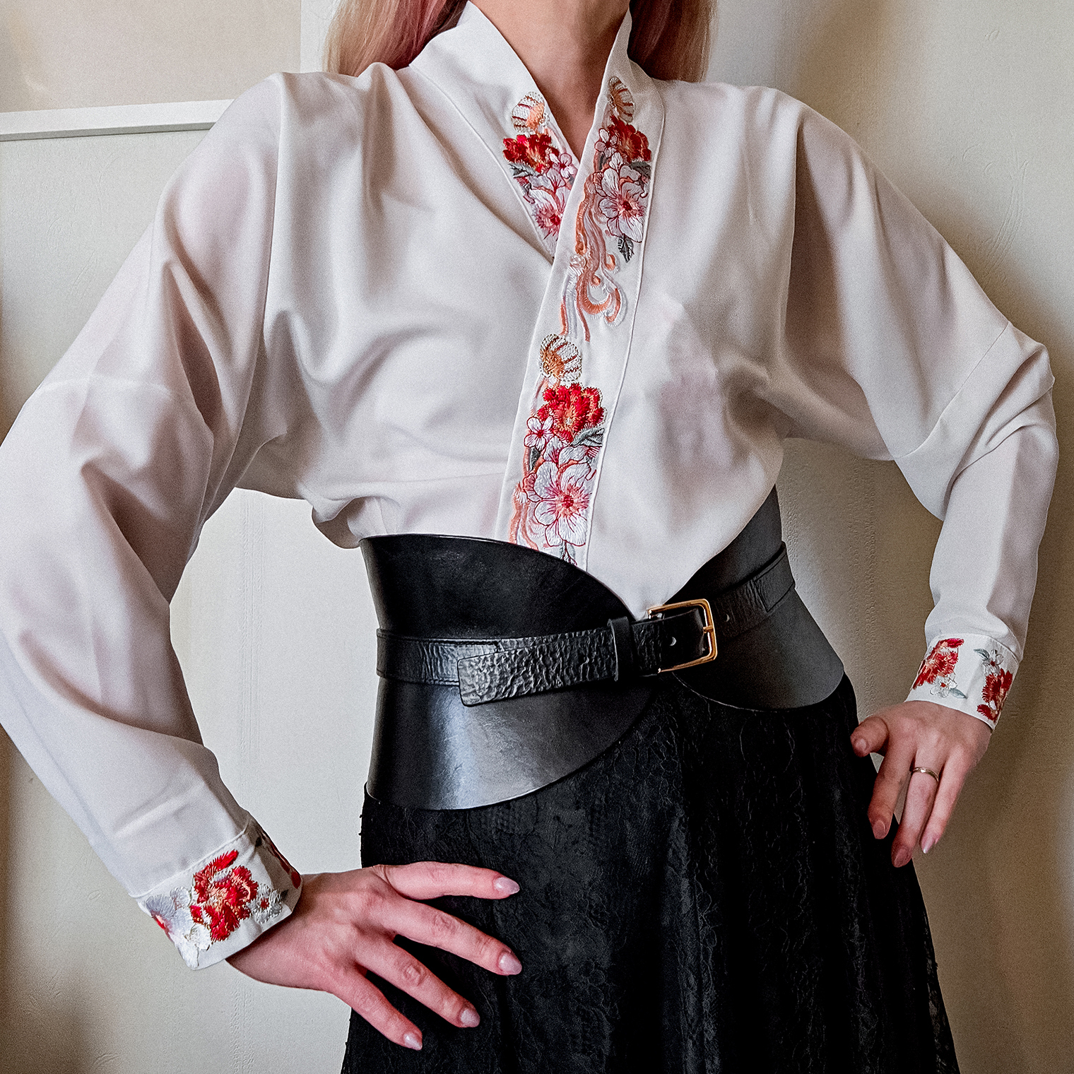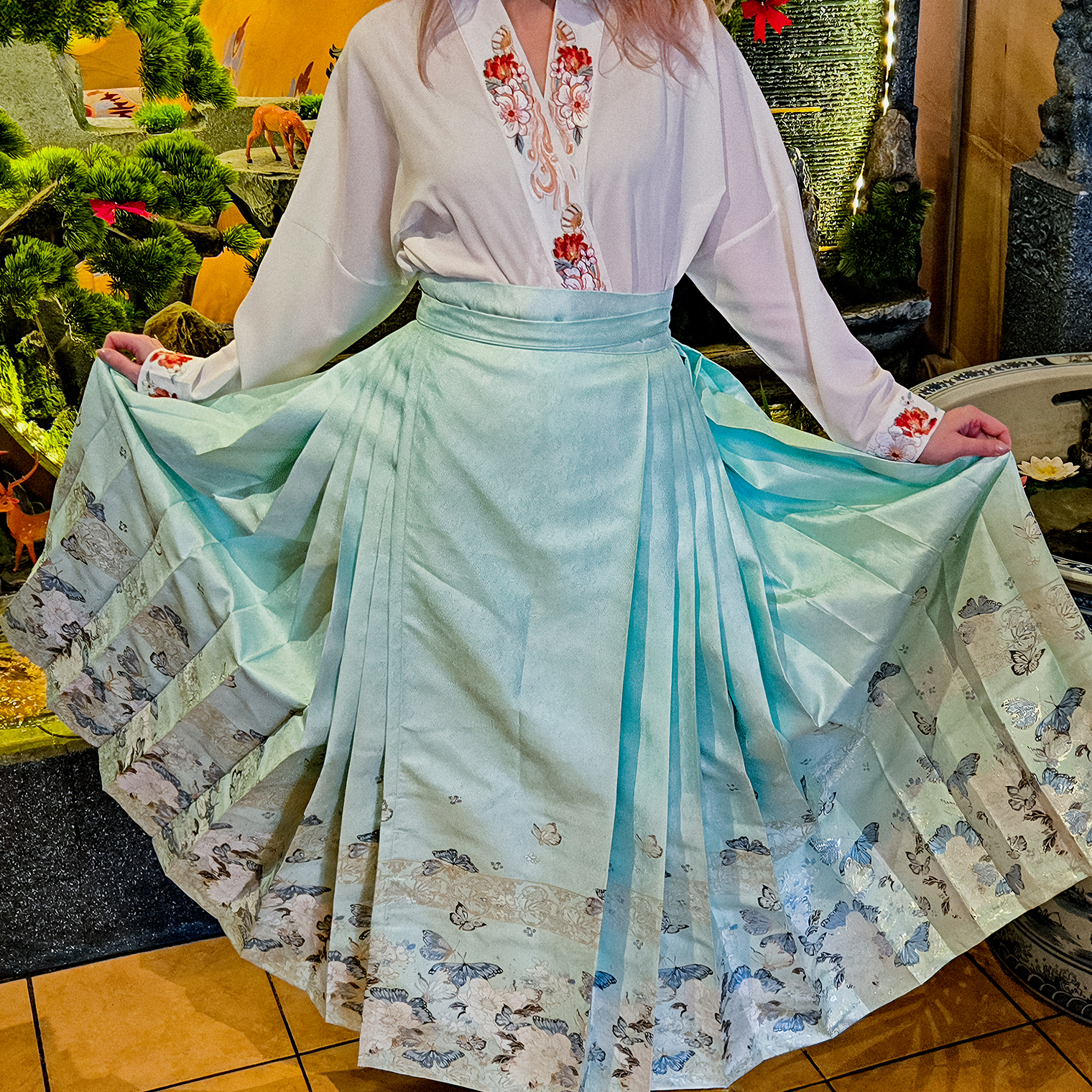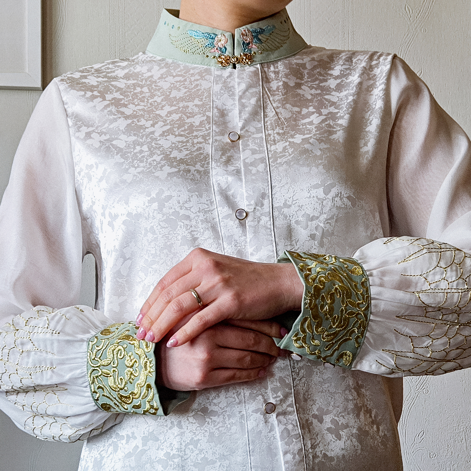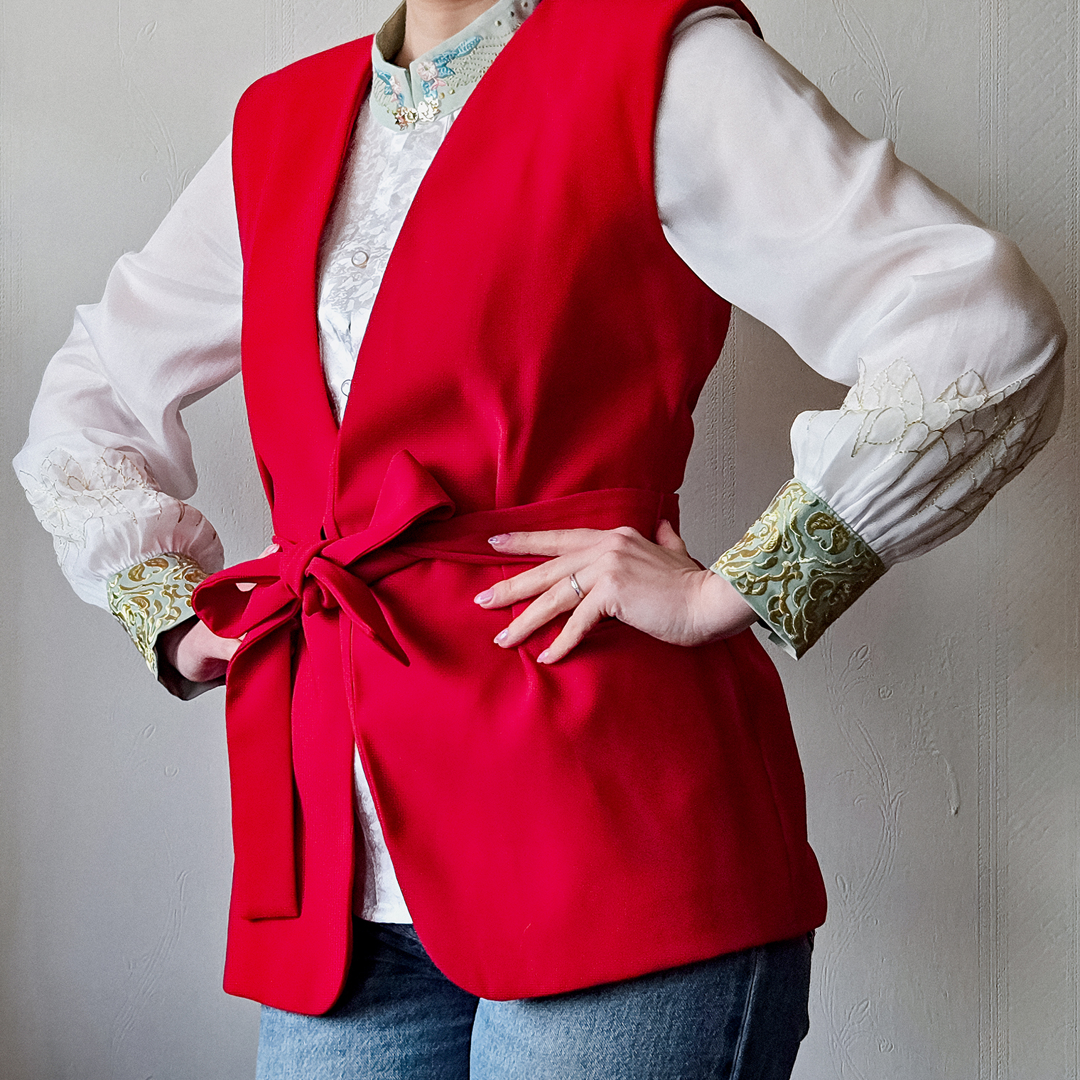 Я купила шикарную юбку всего за 130 ¥ (1 478 ₽) и рубашку с запахом за 200 ¥ (2 274 ₽). Еще взяла нарядную блузу, украшенную шелковыми нитями, за 600 ¥ (6 822 ₽). Ношу ее на выход и использую в более сдержанных образах — для этого «успокаиваю» модным красным жакетом и простыми синими джинсами или черными брюками.