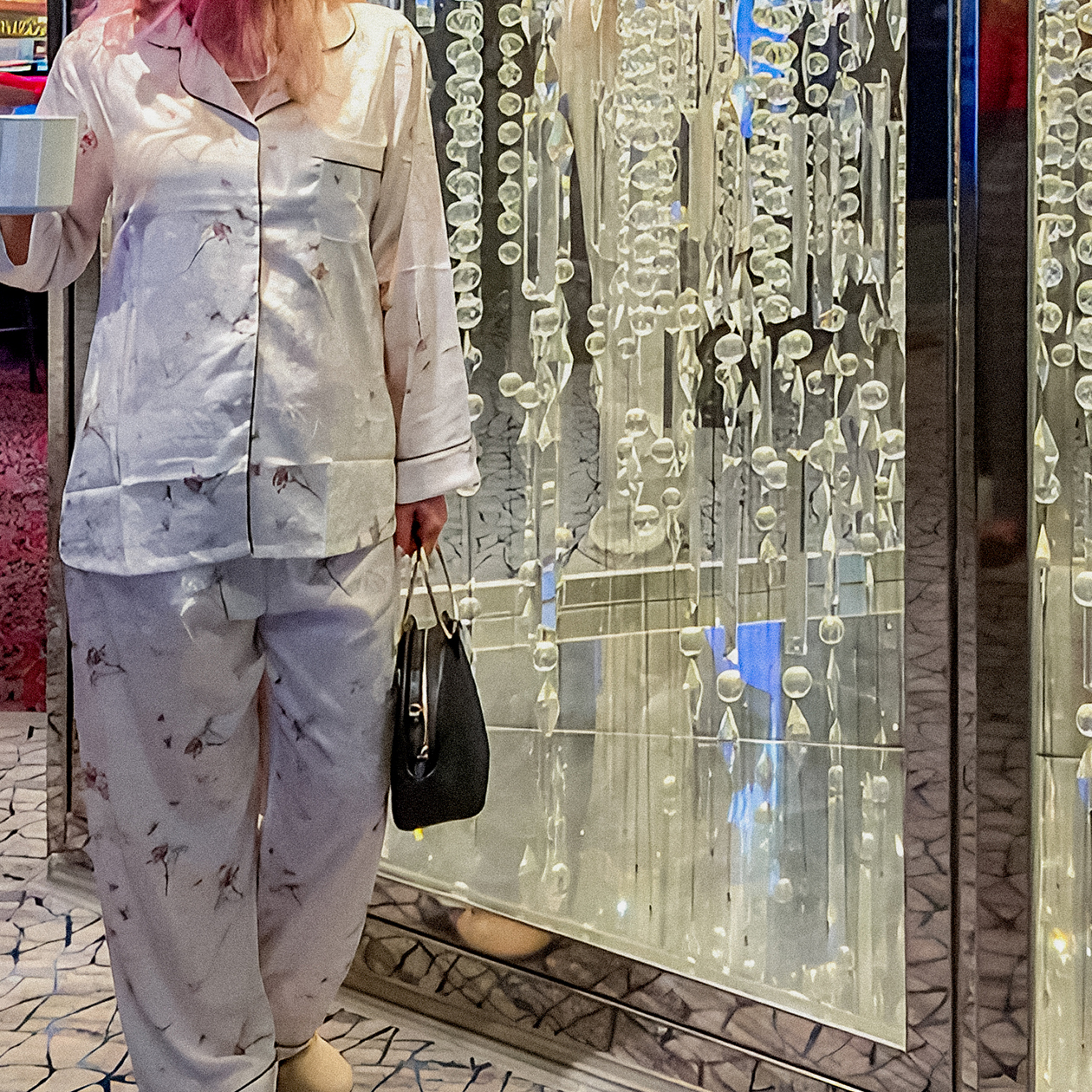 Пижамы. Я купила атласную пижаму с традиционным цветочным узором. Хотела, чтобы она сидела посвободнее, поэтому взяла самый большой размер — XL. Она стоила 150 ¥ (1 706 ₽). Брючки ношу только дома, а вот рубашку могу и на выход: пижамный стиль все еще в моде. Надеваю под нее белую футболку или накидываю сверху кардиган — милое дело.