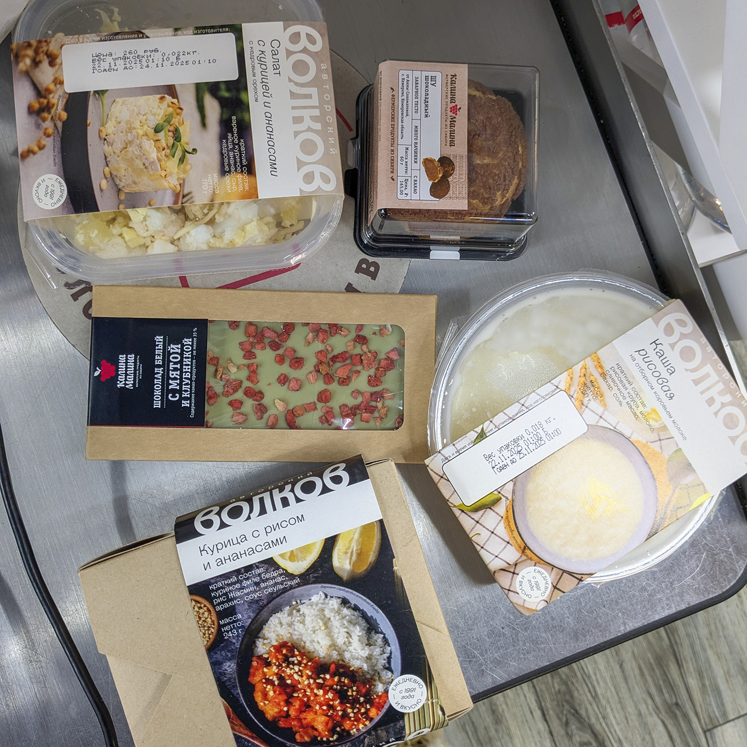 Закупаюсь на пару дней. Беру йогурт, сырники, шаурму, крабовый салат и еще несколько готовых блюд. −2 258 ₽
