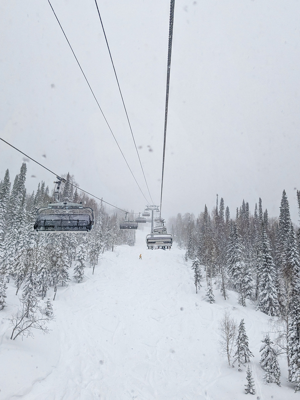 Проходим на подъемник бесплатно: турникеты не работают и охранник пропускает нас просто так. Склон ужаснейшим образом завален снегом — сугробы чуть ли не с меня ростом. Катиться очень сложно, все силы уходят на то, чтобы встать с огромного мокрого пухляка. Мне совершенно не нравится. Но хотя бы удается поездить прямо: обычно я очень боюсь скорости, а на пухлом снегу ее сложно развить.