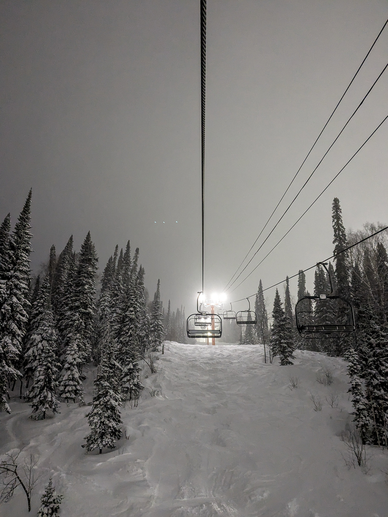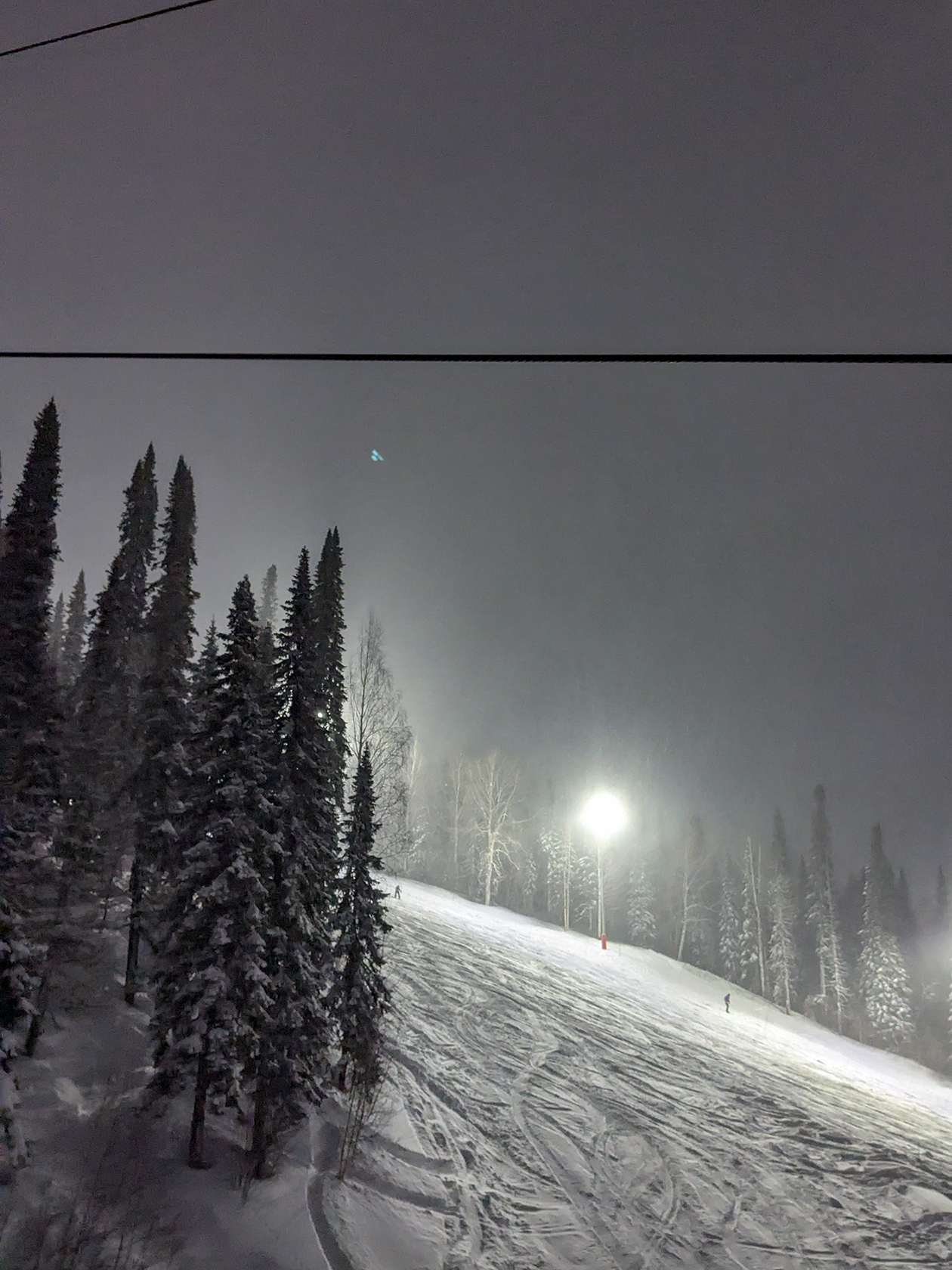 Еду вниз по простой, приятной, длинной трассе. Стемнело, склон освещен фонарями, только что прошлась техника. Вокруг очень красиво: снежные елки, вдалеке мигают огни города. Людей мало, ехать одно удовольствие, но этот спуск явно последний: я заметно устала и начинаю тупить в очевидных вещах. Ловлю себя на мысли, что в какой-нибудь день хочу целенаправленно приехать вечером и покататься несколько часов.
