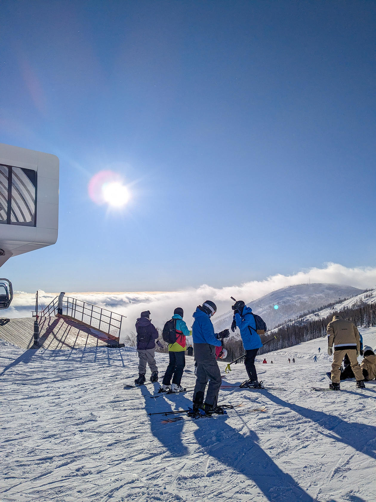План такой. Ребята, которые катаются уверенно, спустятся с Креста на досках. А мы с В. вернемся на снегоходах, потом сядем на подъемник на сложной трассе в секторе Е и съедем вниз уже оттуда. Главная задача всего мероприятия — полюбоваться красотой и наделать фоточек.