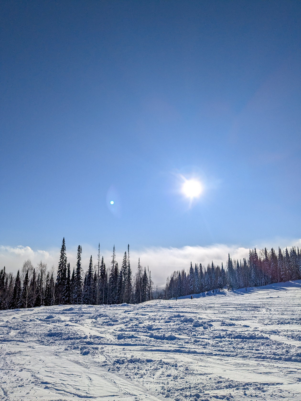 16:00. Спускаемся на снегоходе. Я даже не знаю, что красивее: виды с Креста или этот путь вниз — с солнечной погодой нам очень повезло. В. платит снегоходчику 6 000 ₽. Когда вернемся домой и реанимирую телефон, переведу ей половину.