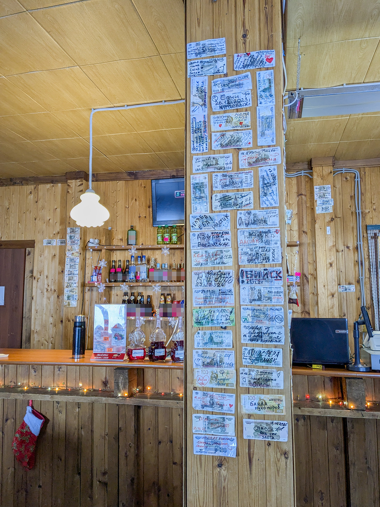 14:00. Мы на вершине Зеленой. Тут совершенно другие виды, похоже на заснеженный Марс, что-то на сказочно-волшебном. Идем в кафе «Вершина» ждать наших водителей. Внутри все увешано купюрами с разными надписями, хожу читаю.