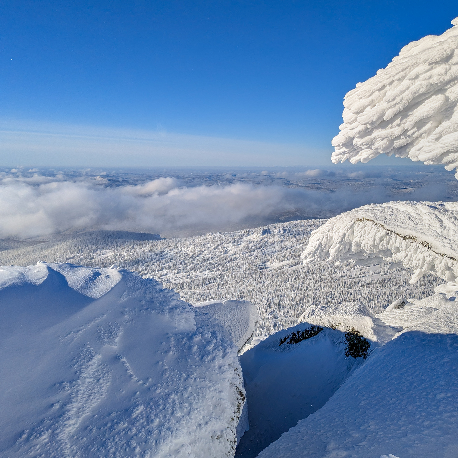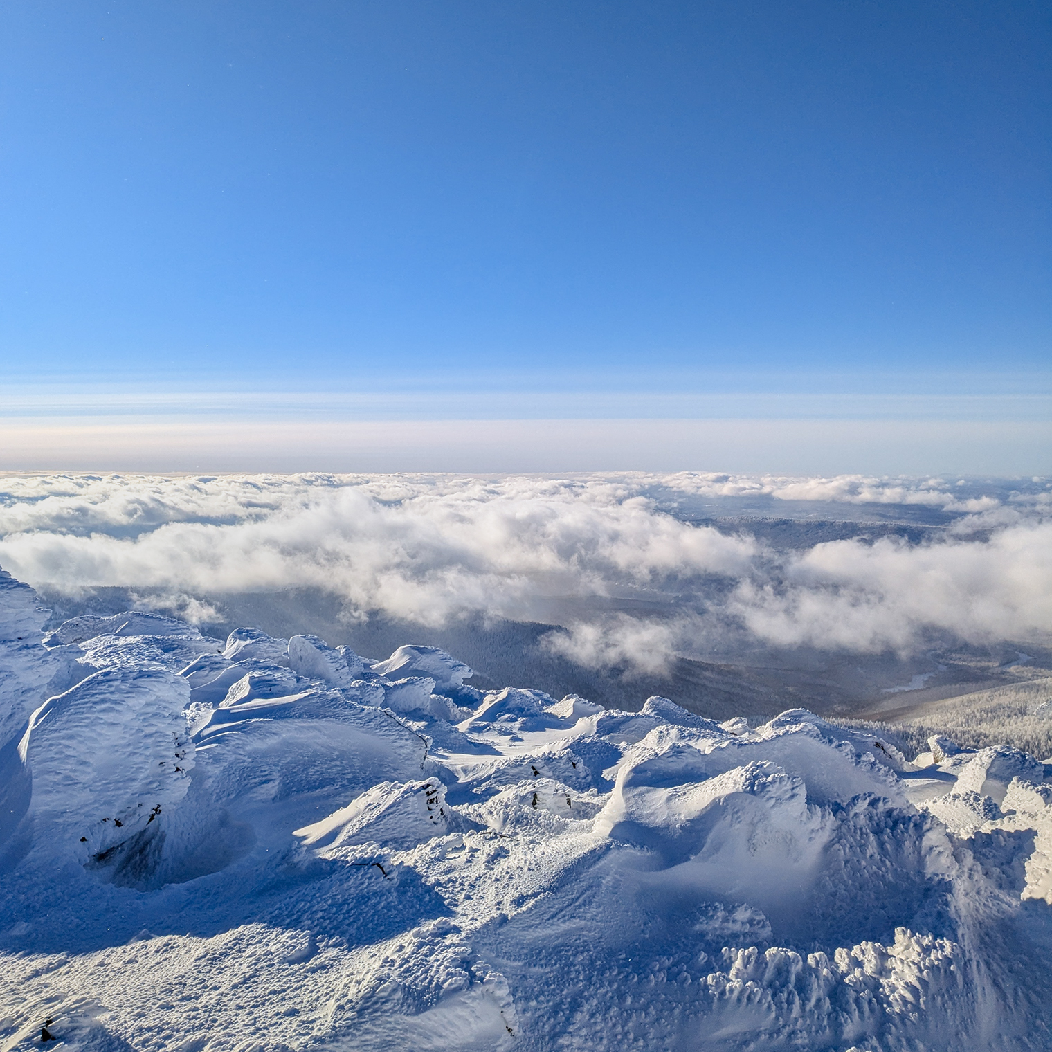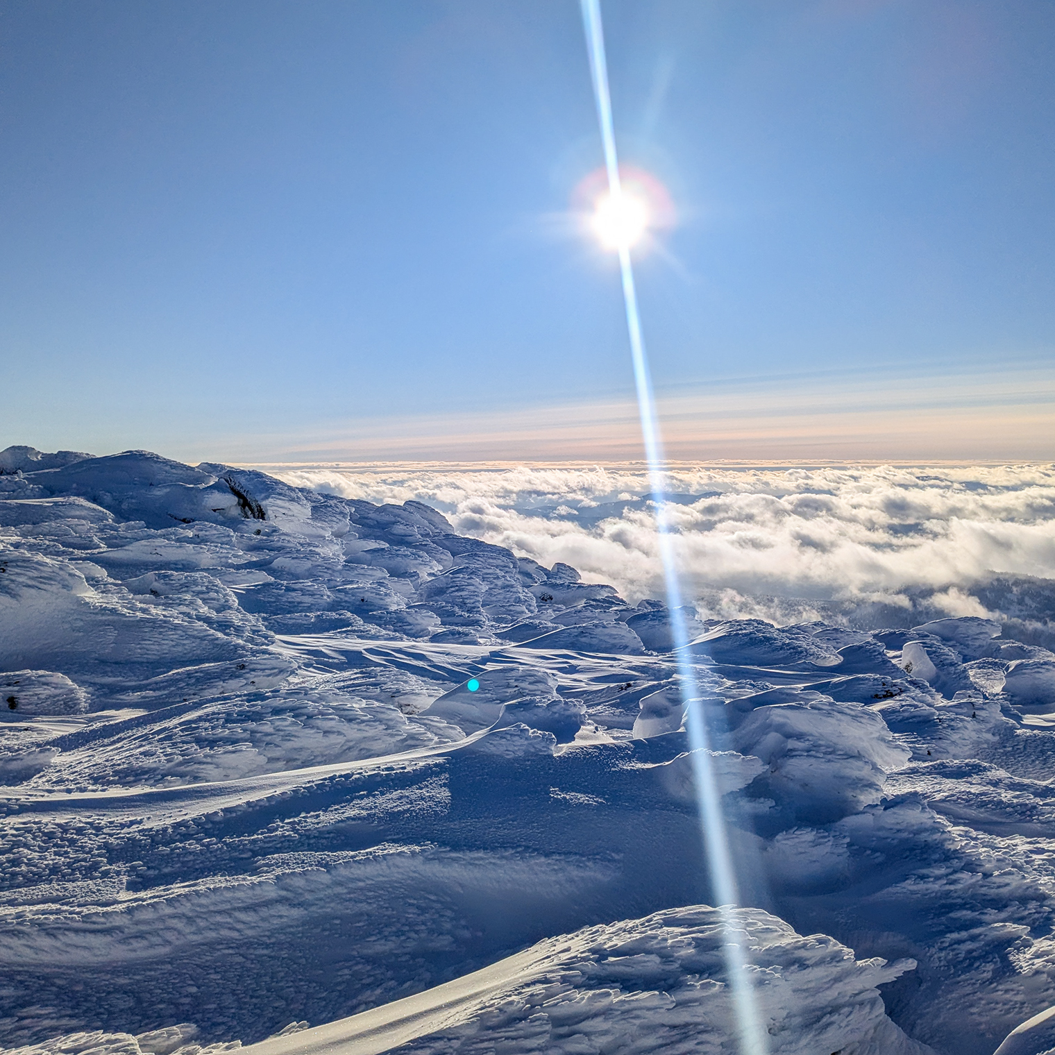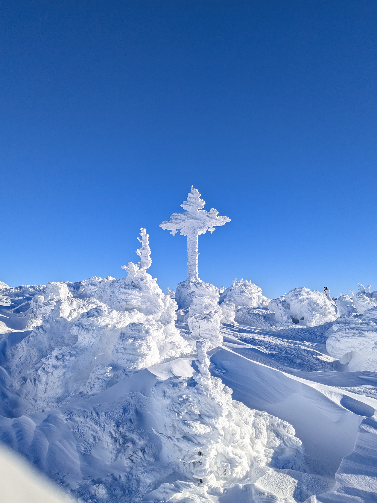 15:00. Лазим вокруг поклонного креста, любуемся, делаем фото. Вид просто невероятный, все еще не могу поверить в его существование и продолжаю по-тихому плакать от красоты. Пытаюсь фотографировать, но это сложно. Вытаскивать руки из перчаток — плохая идея, поэтому приходится тыкать боковые кнопки. Как результат, уже дома я увидела, что на многих кадрах закрываю экран пальцем. Было очень обидно их удалять.