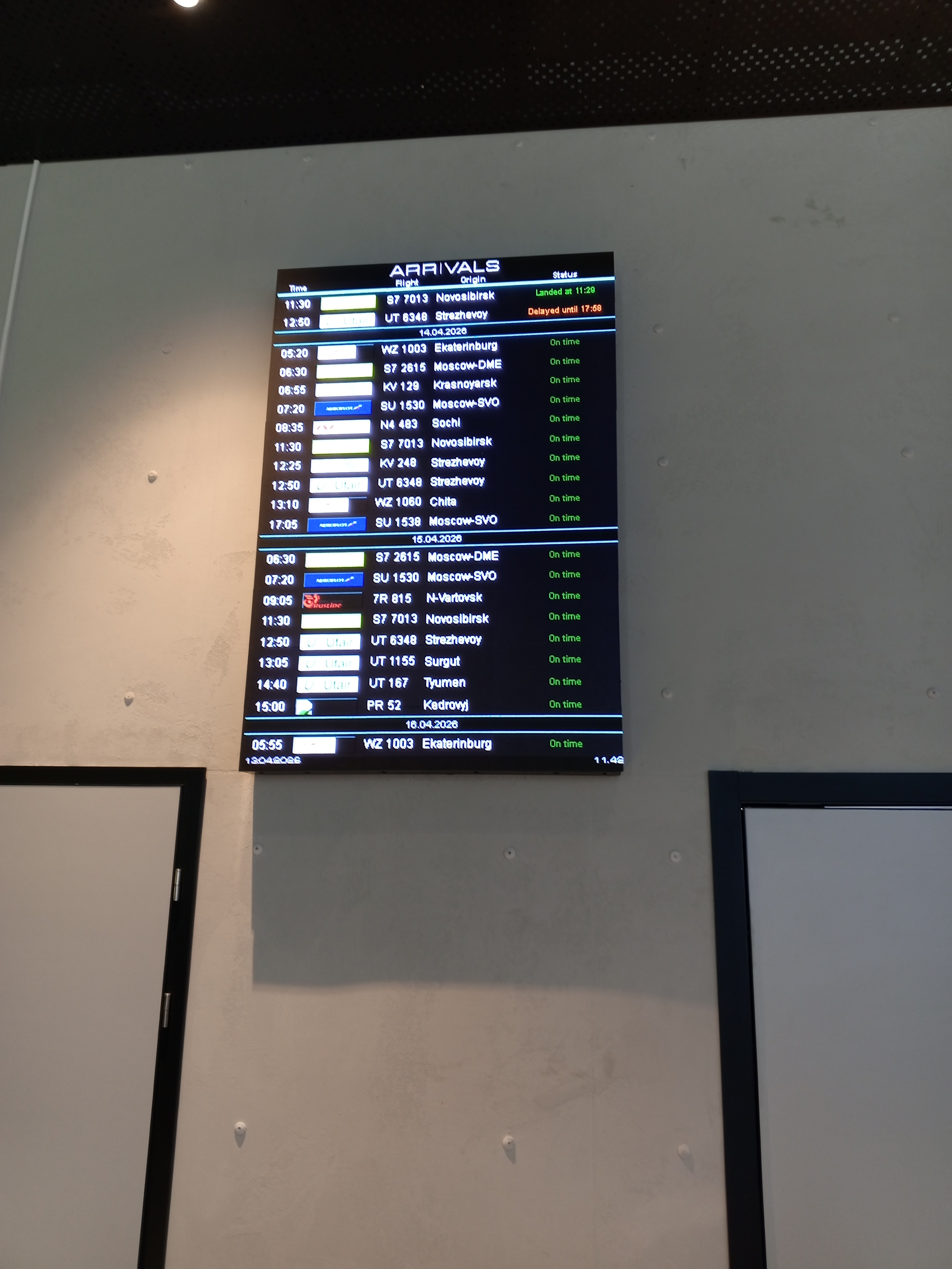 8:05 Захожу в аэропорт Толмачёво. По привычке перед входом положил ключи, смартфоны, бумажник в рюкзак, чтобы не терять время на КПП. Рамку прошел быстро, меня попросили включить ноутбук для проверки — сделано. Далее, на всякий случай, переобулся из своих деловых туфель в беговые кроссовки. Вдруг с багажом будет накладка, а я совсем без обуви на марафоне.
