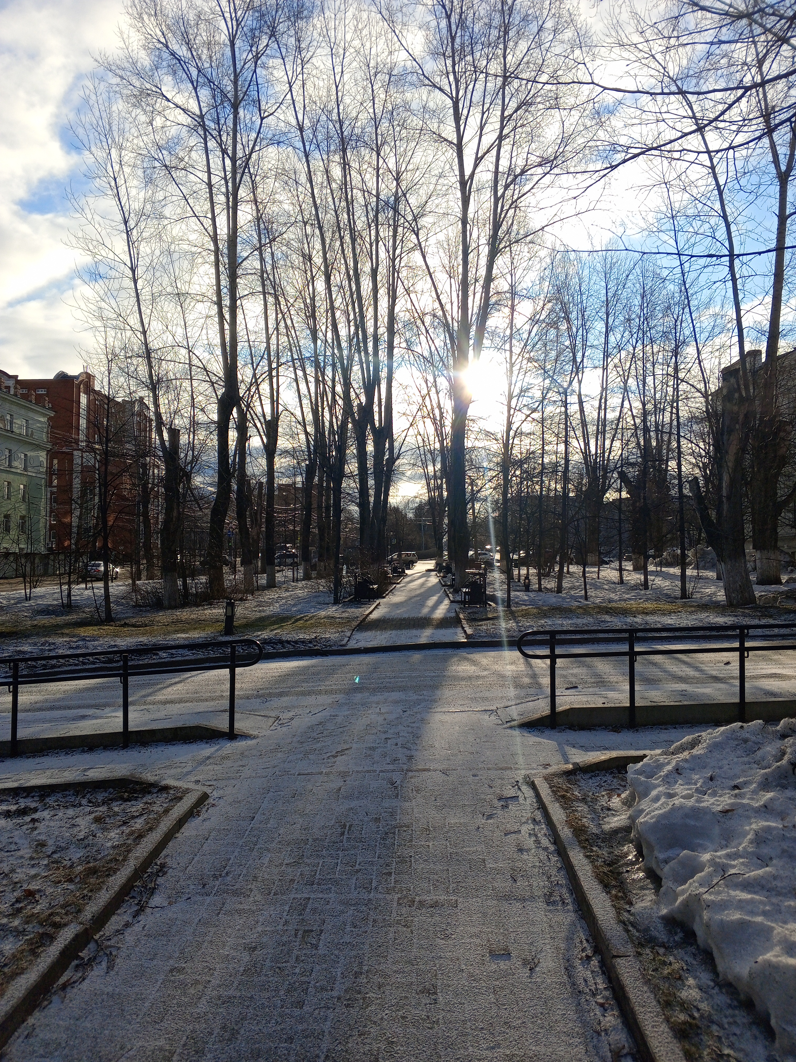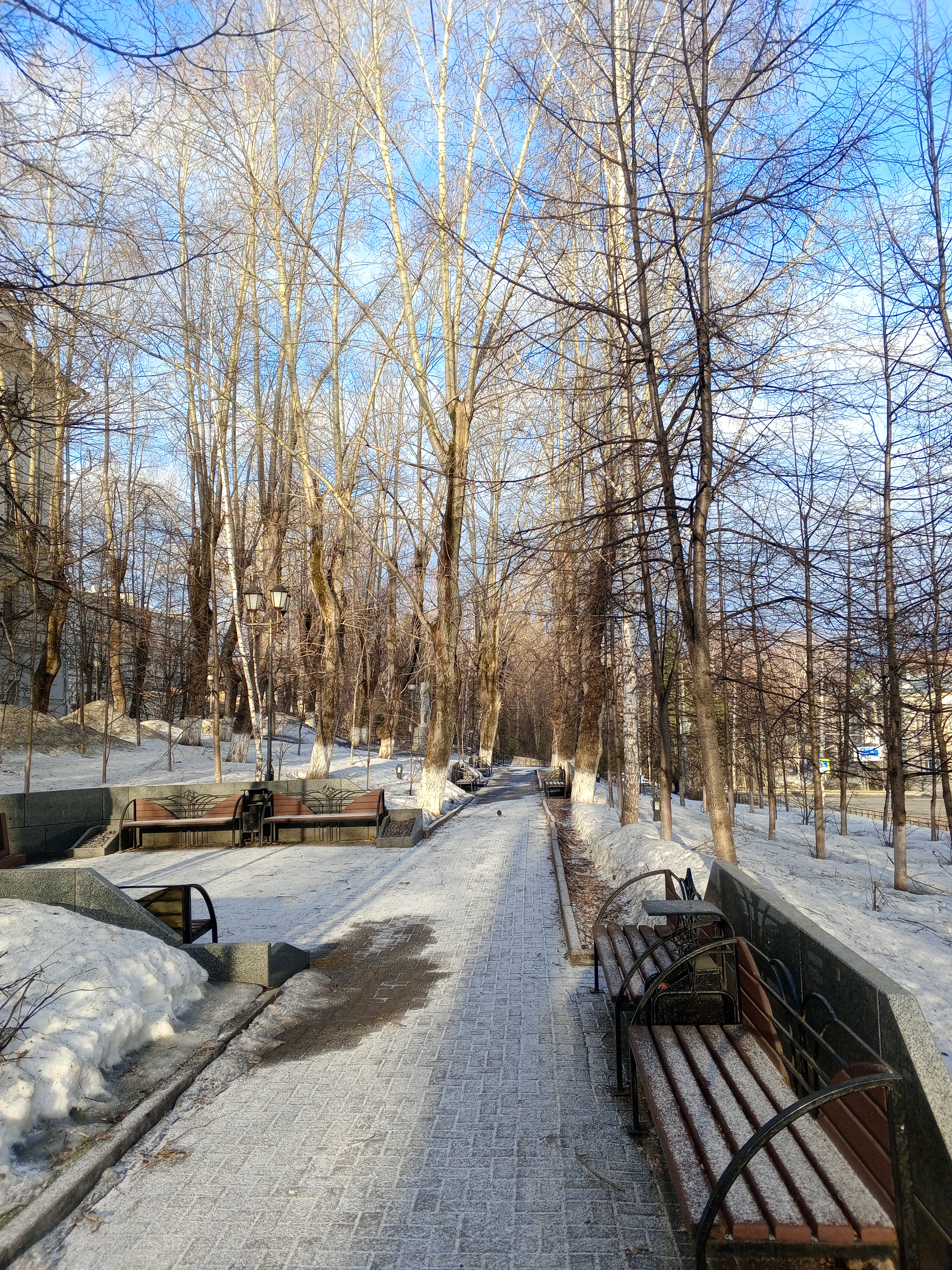 8:30 Пробежал около семи километров и снова по проспекту Кирова. Неожиданно прорезалось томское солнце, на асфальте была легкая наледь, фотографии получились красивые — специально останавливался для снимков. Темп был в районе 8:00, самое то — для восстановительной пробежки. По пути встретился с одной знакомой томской бегуньей, поговорили про местные активности и вчерашний марафон, поделился своими противоречивыми впечатлениями.