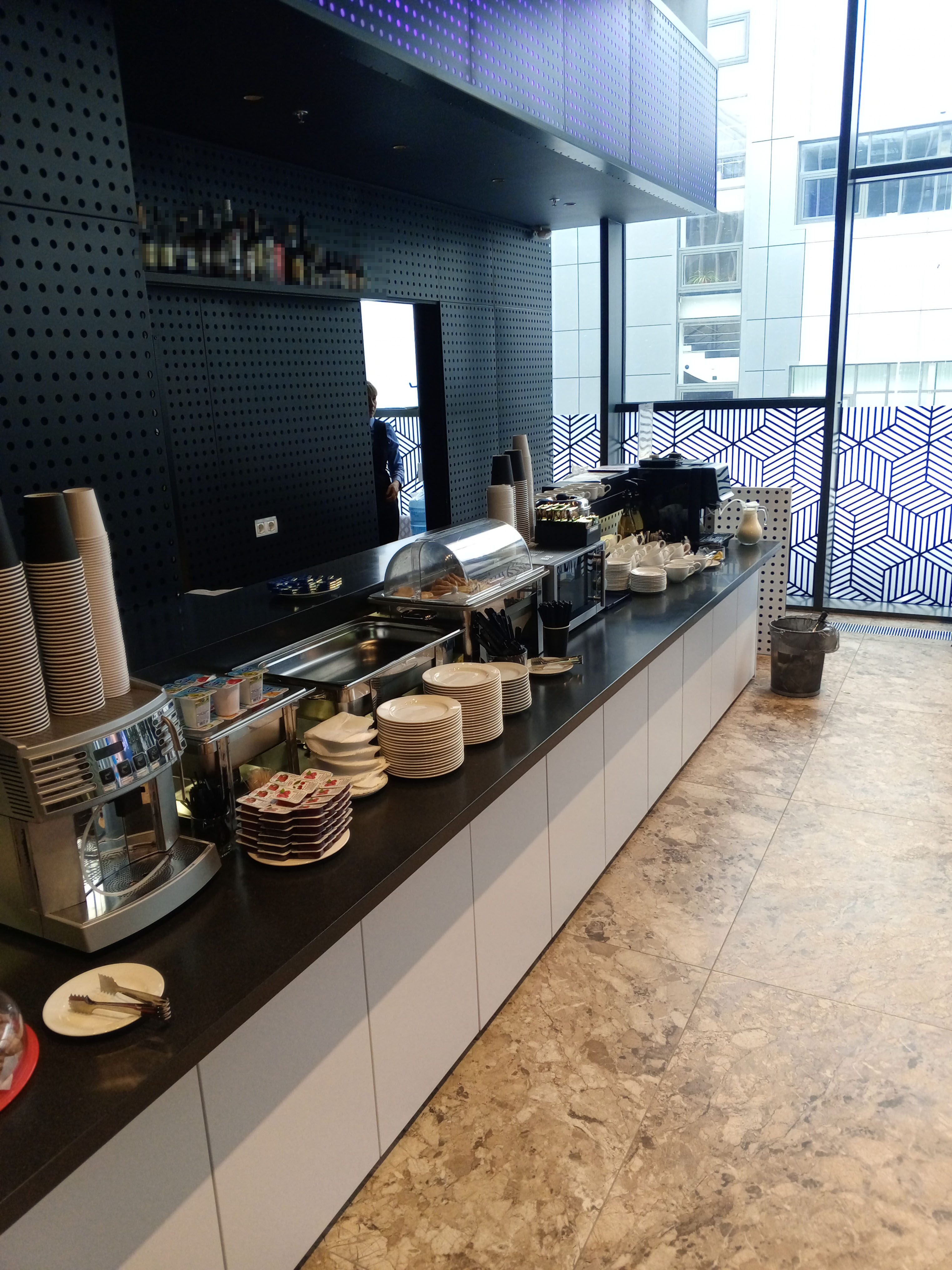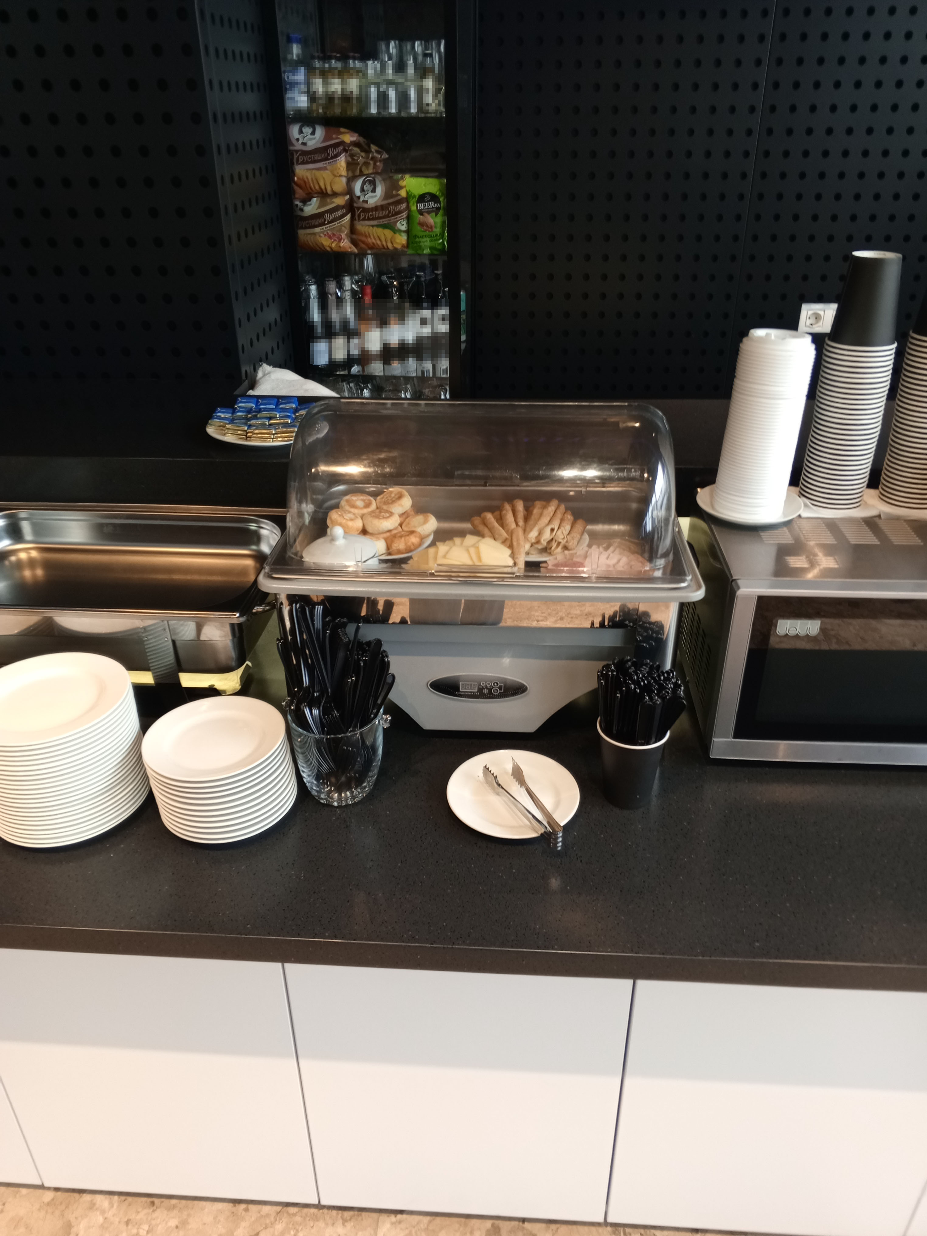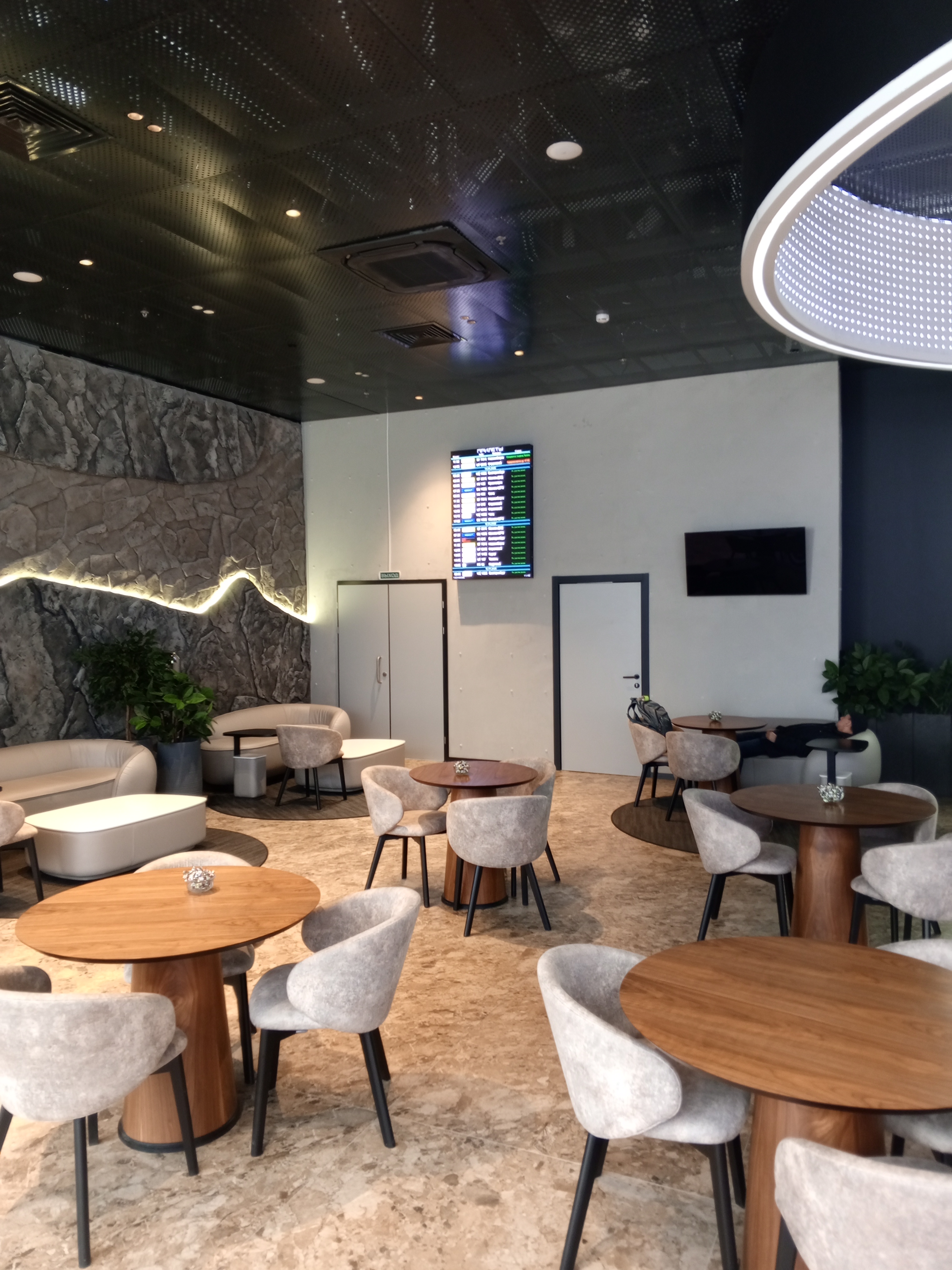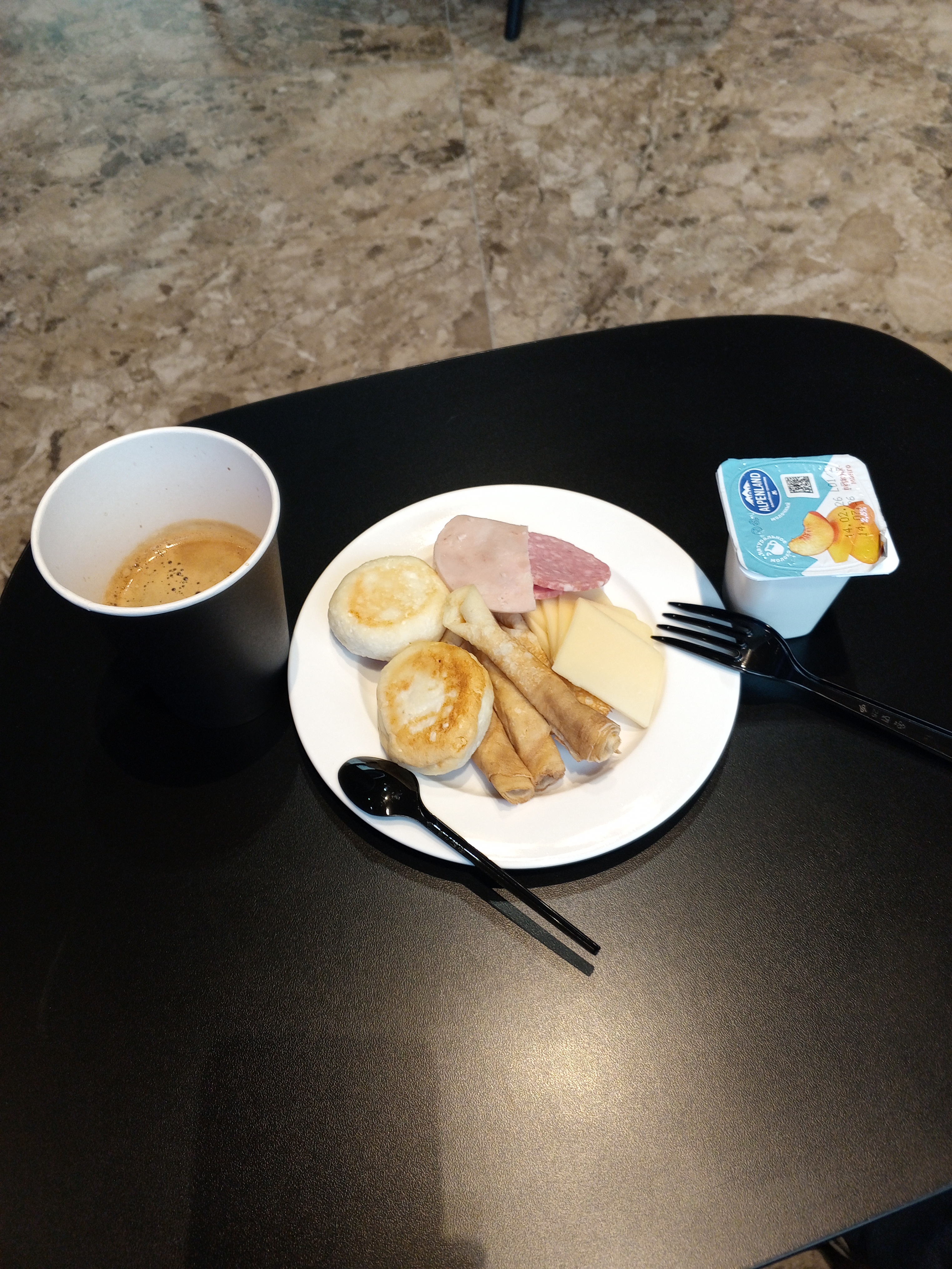 В «чистой зоне» сразу иду в бизнес-зал. Он тут называется «бизнес-зона». Там просторно, много столиков и розеток, словно ты в коворкинге или ресторане. Беру американо, из еды — сырники, блинчики, сырную и колбасную нарезку и йогурт. Пойдет, в качестве такого своеобразного «континентального завтрака».