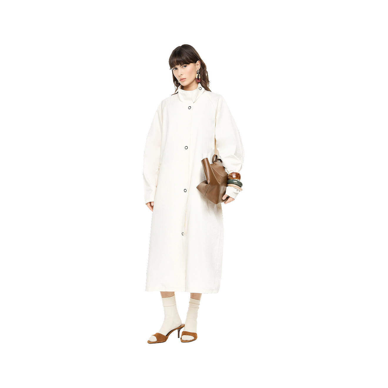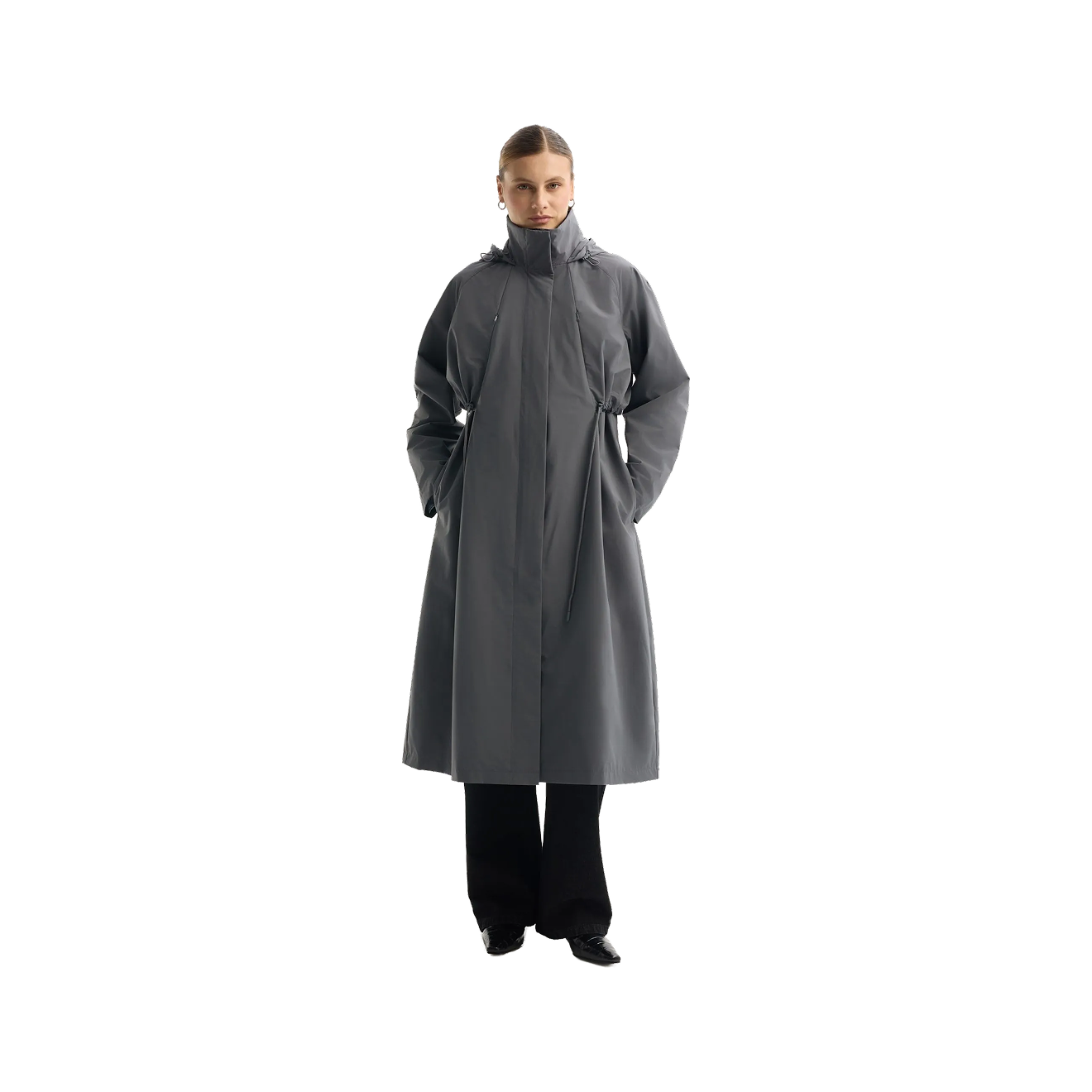 С одной стороны — бренды массмаркета и мидл-сегмента ежегодно выпускают классические варианты тренча и его сезонные мутации. Например, плащ А-силуэта с отложным воротником и куртку-тренч.