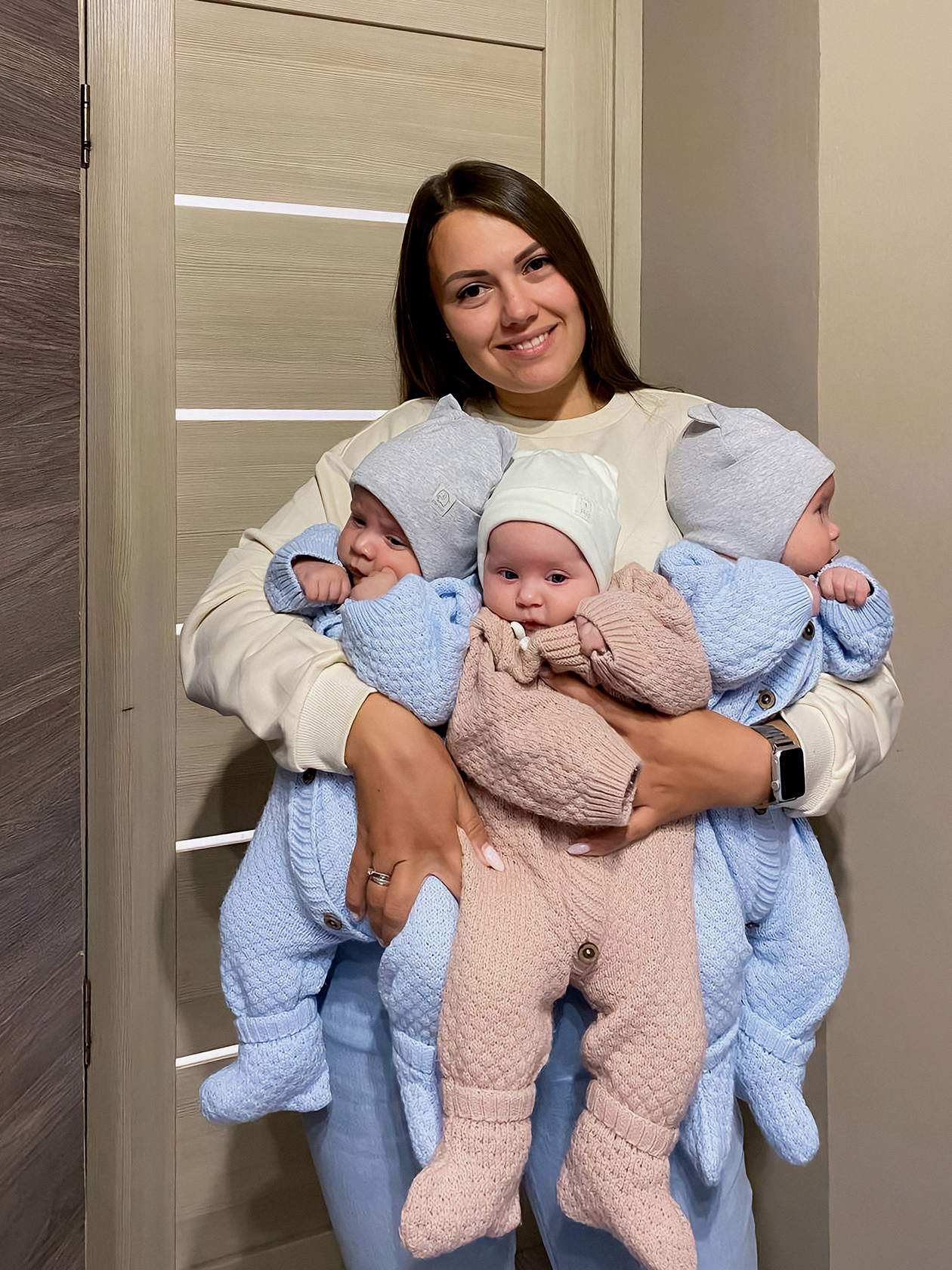 Поскольку у меня была операция под спинальной анестезией, я находилась в сознании, все видела и слышала. В реанимации думала о том, как бы скорее подняться, чтобы пойти к детям. Пришла моя замечательная доктор и сказала, что с детками все хорошо. Добавила: «Вставай на ноги, вечером их тебе принесут в палату». И тогда я немножко запереживала. Подумала: «Как? Всех сразу? Может быть, по одному?» Но нет, ближе к 19:00 меня перевели из реанимации, а в 22:00 привезли всех троих, и мы начали привыкать друг к другу.