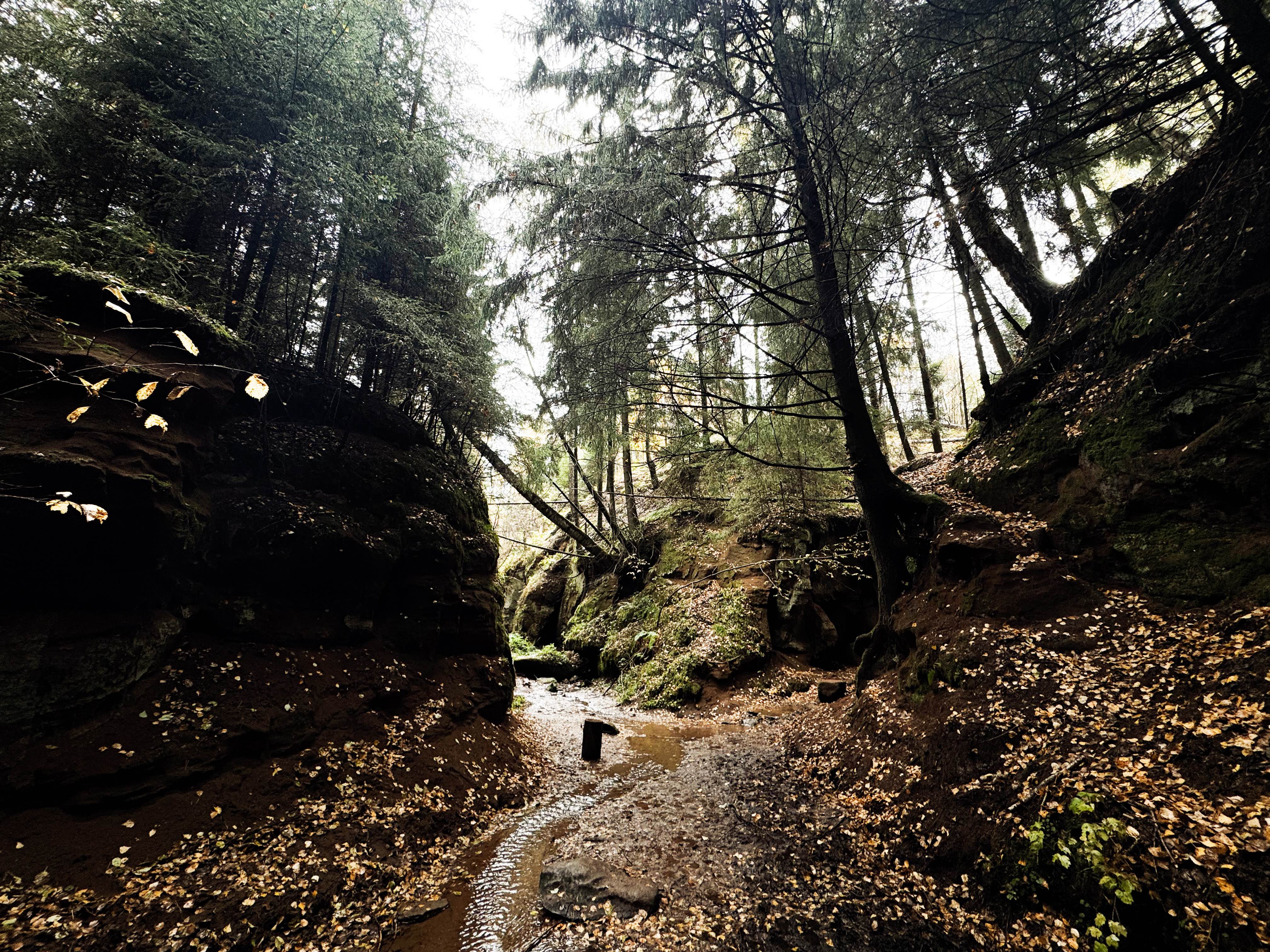 Реальность превзошла ожидания. Абатские пещеры — место, где хочется замедлиться и просто смотреть по сторонам. Как только попадаешь в ущелье, с открытым ртом рассматриваешь скалы, огромные корни деревьев и мох. Резиновые сапоги пригодились: идти приходится по неглубокому ручью, чтобы лучше рассмотреть ущелье. Вода здесь круглый год около +4 °C, поэтому даже летом стоит захватить подходящую обувь.
