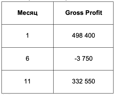 Таким образом, за первый, шестой и одиннадцатый месяцы Gross Profit выглядела так: