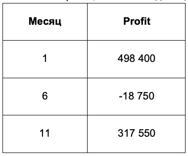 Первый скачок был за счёт гранта, но настоящая окупаемость наступает в 11-м месяце: разница Profit net (N) и Profit net (N-1) равна 83 725 рублей.