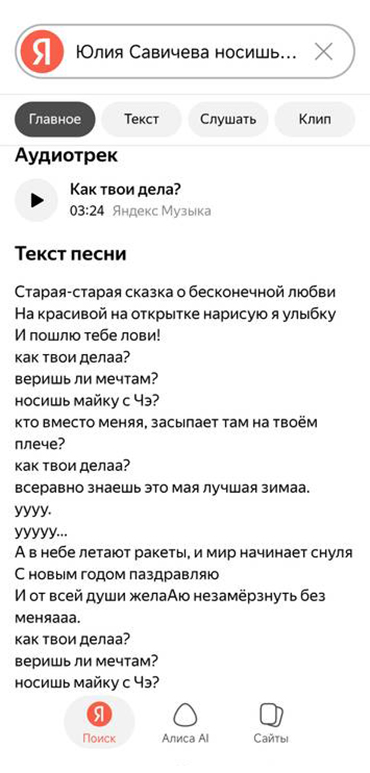 Я в ужасе, что в Яндексе опубликован текст с ошибками! Понимаю, что Савичева не очень четко пела некоторые слова, это эстрадная манера пения. Но я так полагаю, ИИ сделал транскрибацию автоматом, а получилось «пишу то, что слышу»!