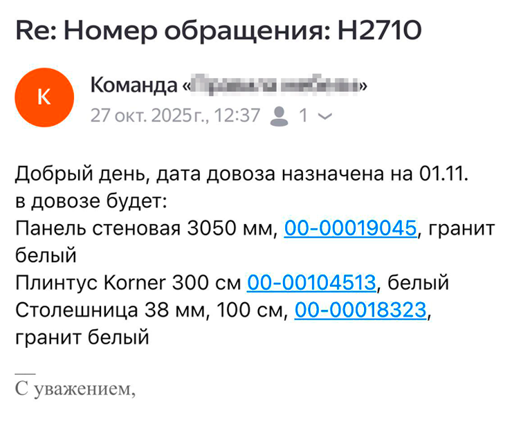 На письмо я даже не успеваю ответить, как тут же получаю звонок от магазина, где мне снова сообщают, что якобы не могли до меня дозвониться, и подтверждают дату доставки. С недоверием интересуюсь, а что мне, собственно, прислать собираются. «Нет-нет, вы мне не по телефону, а на почту списочек, пожалуйста». Прислали даже с артикулами. Невиданное дело. Номер обращения я, к слову, вижу впервые. Фантастика.