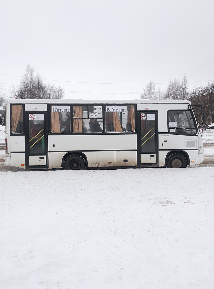 Я решила поехать до Котласа-Южного и не прогадала. Это железнодорожная станция крупного города Котласа, который находится рядом с автовокзалом. Оттуда без проблем можно сесть на автобус до Великого Устюга. Правда, купить билет в кассе не удалось: их продавали прямо в автобусе.