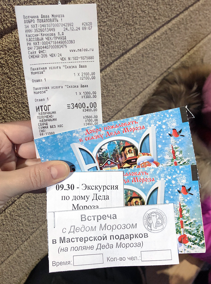 Билеты на территорию усадьбы Деда Мороза можно купить на официальном сайте и в кассе. Где-то я читала, что лучше делать это на месте. Больших очередей с утра нет, зато есть возможность спросить, куда и какой билет брать.