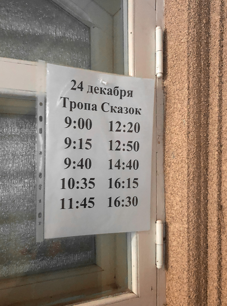 Обычно после покупки комплексного билета люди отправляются на Тропу сказок. Рядом с ее началом висит график проведения экскурсий, поэтому сориентироваться несложно. Постепенно гости приближаются к дому Деда Мороза и идут туда на экскурсию. Нам же сообщили, что усадьбу скоро закроют для проведения фестиваля, поэтому ее стоит посетить в первую очередь.
