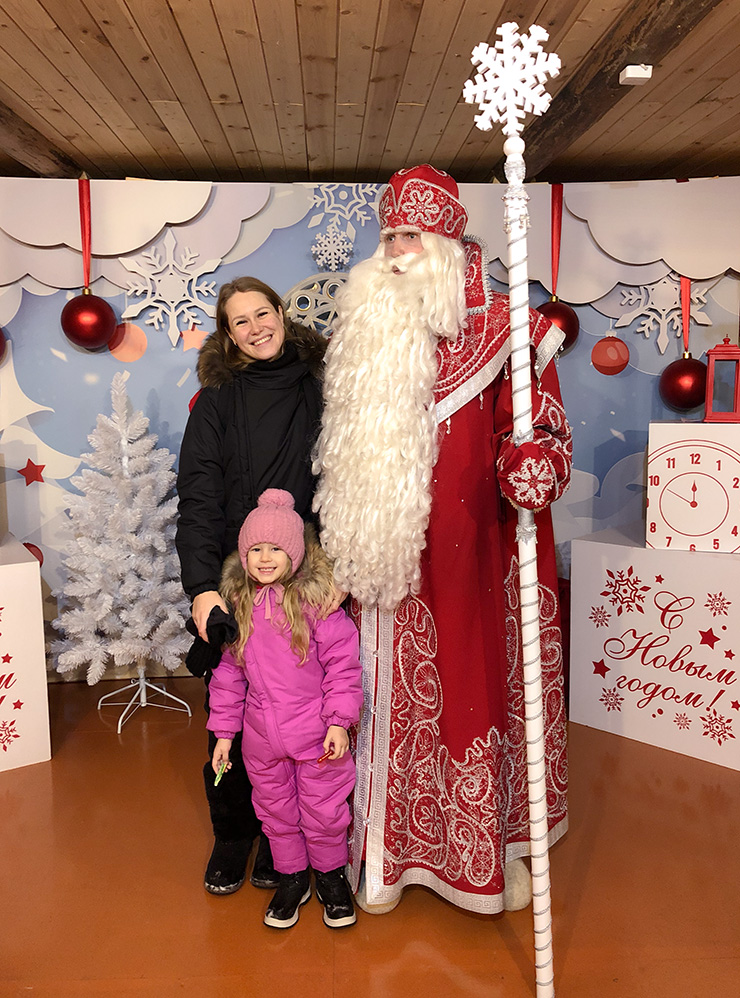 Сама встреча с главным волшебником случилась позже и в другом здании. Нас он впечатлил: выглядел как тот самый добрый дедушка из сказок — с длинной бородой и в красиво расшитом костюме. Дочка рассказала стихотворение, в ответ Дед Мороз дал ей наставления и угостил конфетой-сосулькой. После нас сфотографировали.