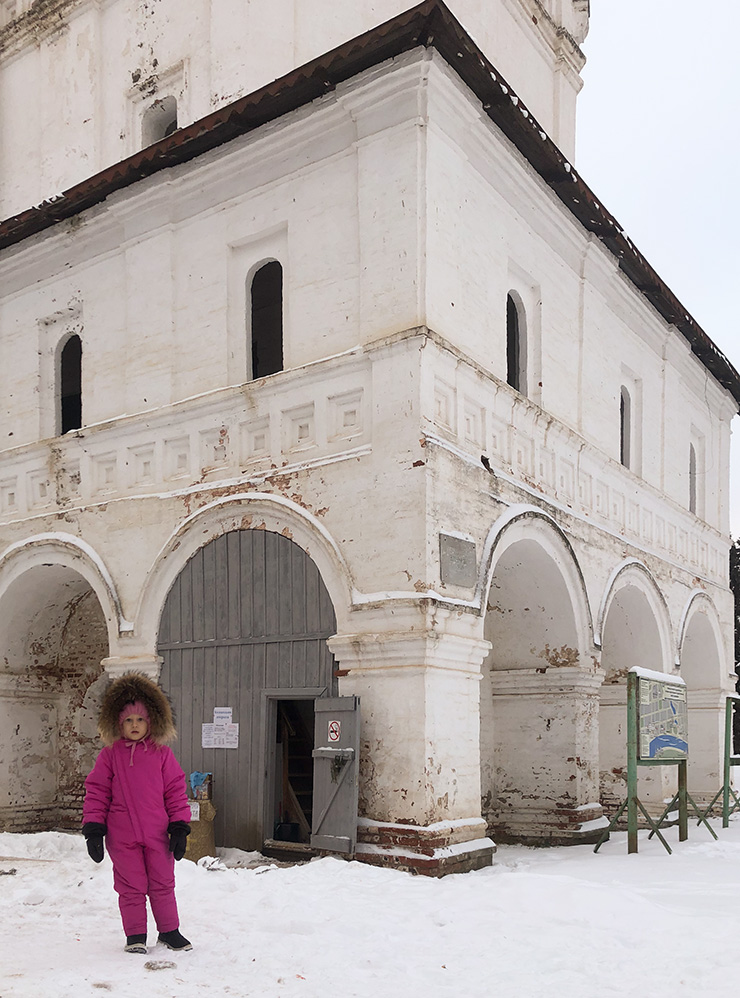 Подниматься недолго и несложно: постройка не слишком высокая. Тем не менее с нее открывается прекрасный вид на ледяную гладь реки. Звонарь сопроводил нас и даже разрешил дочке побить в колокола — она была в восторге. Конечно, без него так делать запрещено, об этом напоминало объявление.
