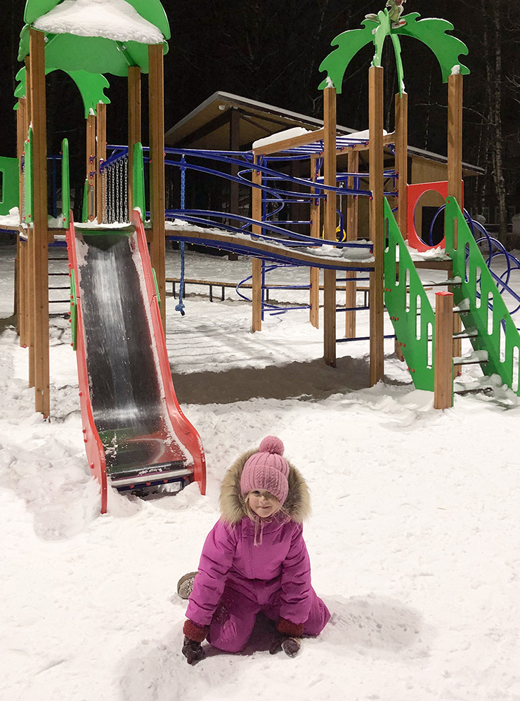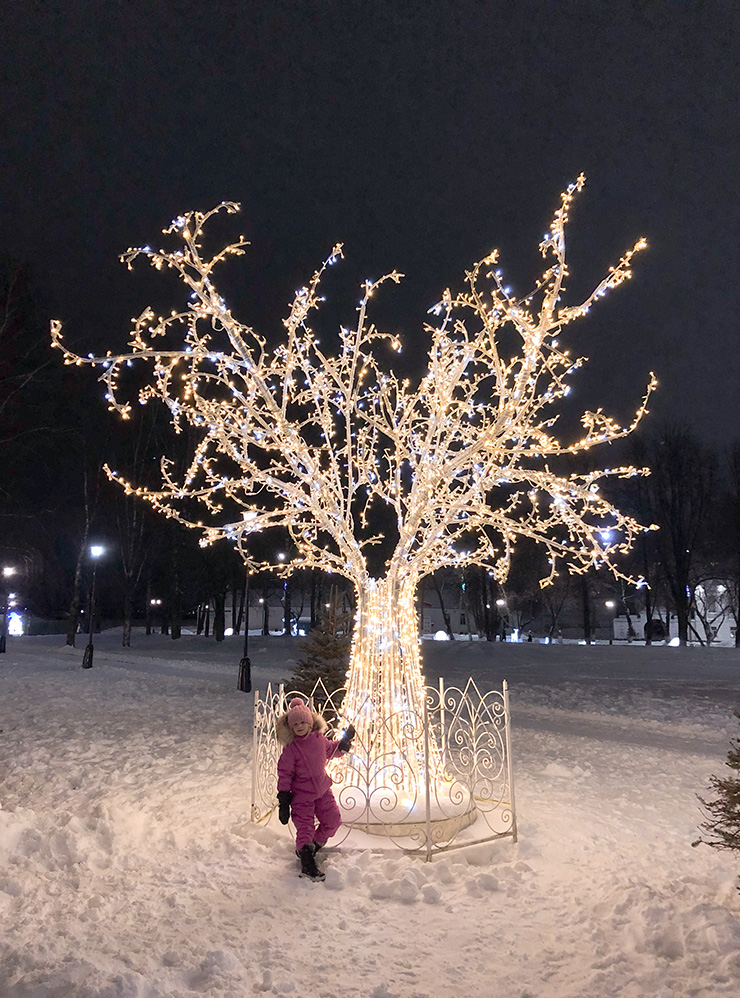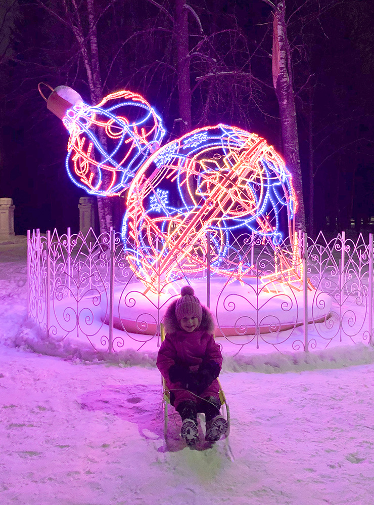 Так, прямо у дома Деда Мороза стояла огромная праздничная елка, были установлены подсвечиваемые качели и большая ледяная горка. Дочка много времени провела на качелях и каталась с горки — я с трудом увела ее оттуда.