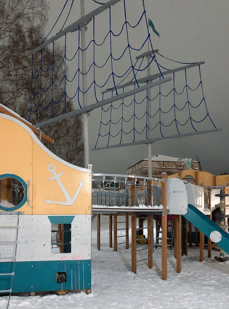 Там была установлена большая елка, сцена, скульптура большого глобуса. Хорошо освещенная и безопасная детская площадка понравилась дочке. Вокруг много лавочек, но зимой на них долго не посидишь — я нахаживала круги по скверу, ожидая, когда ребенок наиграется.