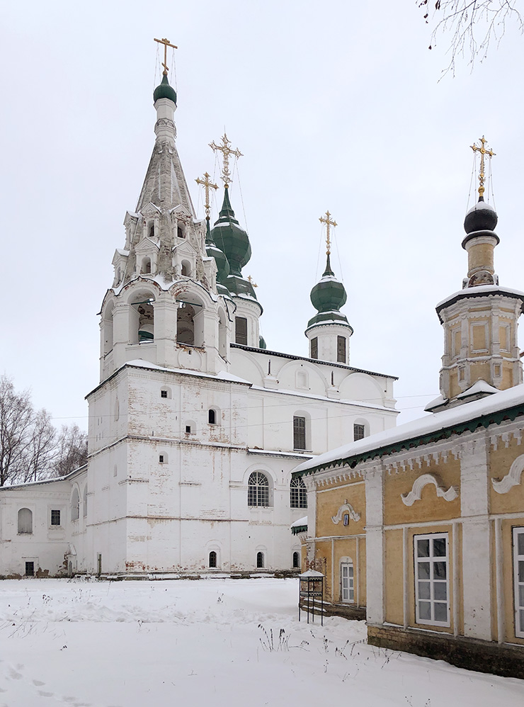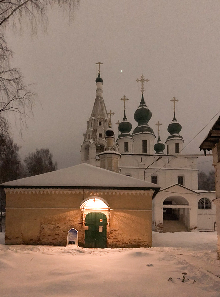 Михайло-Архангельский монастырь — один из старейших в Великом Устюге. Экскурсии проводят только летом по предварительной записи, билет для взрослого стоит 400 ₽. Зимой посетить постройки не получится, но нам было интересно, поэтому мы зашли на территорию и прошли немного дальше, где нас облаяла собака. Пришлось вернуться.
