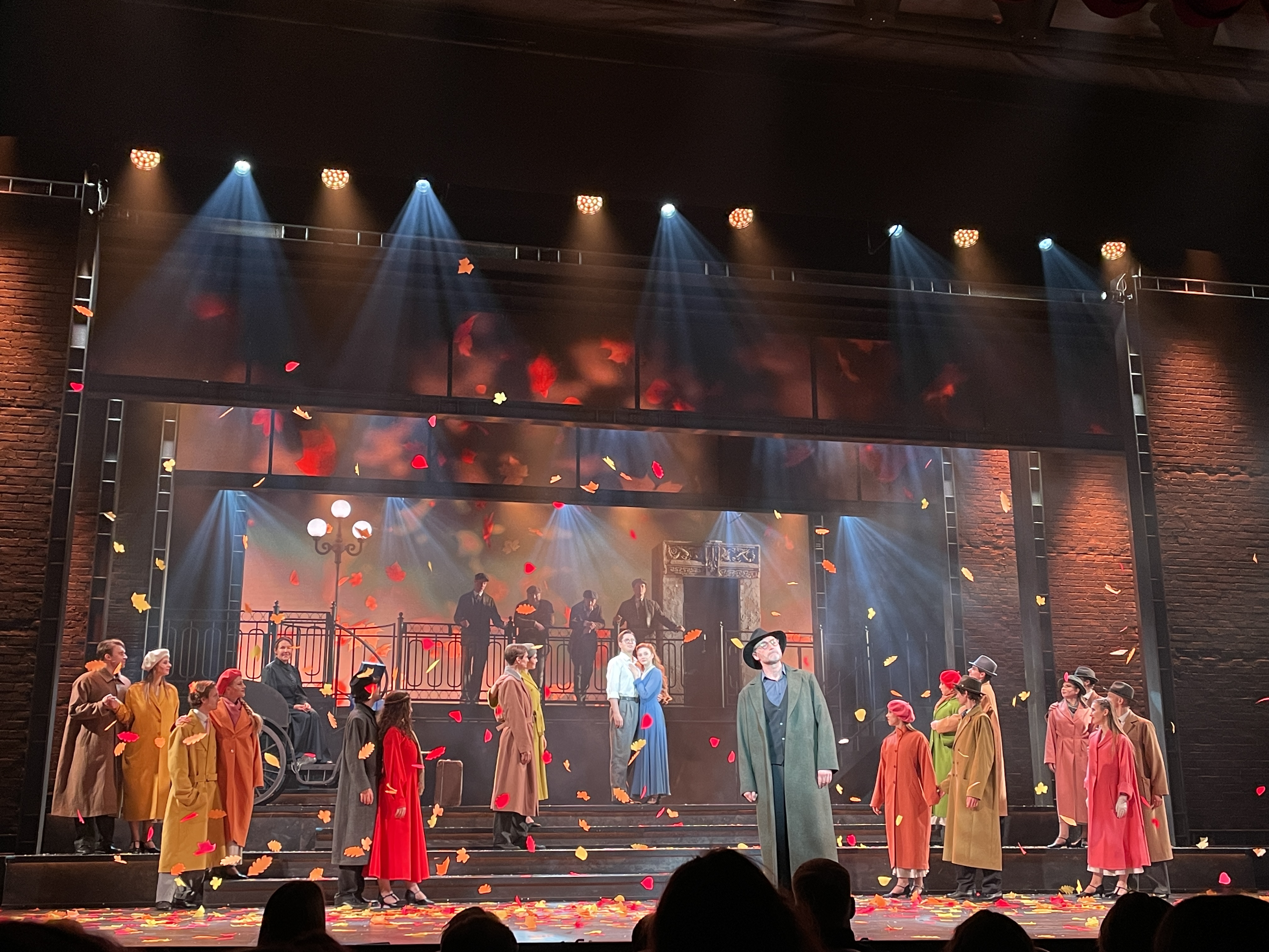 Для меня мюзикл — это песни и танцы. Песни и исполнение запомнились ярко, из танцев больше радости подарила финальная осенняя сцена, где актеры кружал в пальто невероятных оттенков. Почему-то красота и гамма цвета ткани мужских и женских пальто произвела на меня впечатление. Настолько даже костюмы отражали кружение осенних листьев в вальсе.
