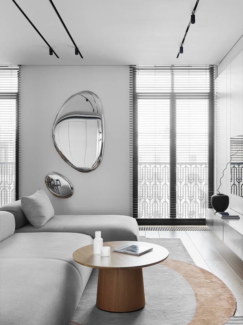 Вдохновителем послужила великая школа архитектуры Баухаус. Их отличительные черты здесь — это монохромные оттенки, металл, чёткая и понятная геометрия, собранная из мебели и цветовых акцентов, которые собираются в гармоничную композицию. Например, ТВ зона здесь — это не просто чёрный прямоугольник на стене, а уже единая линия, собранная из глянцевых панелей.