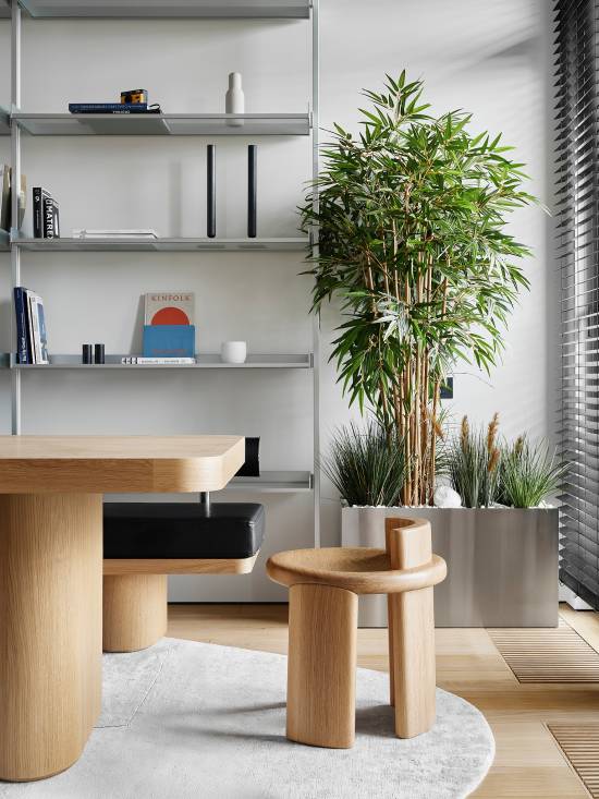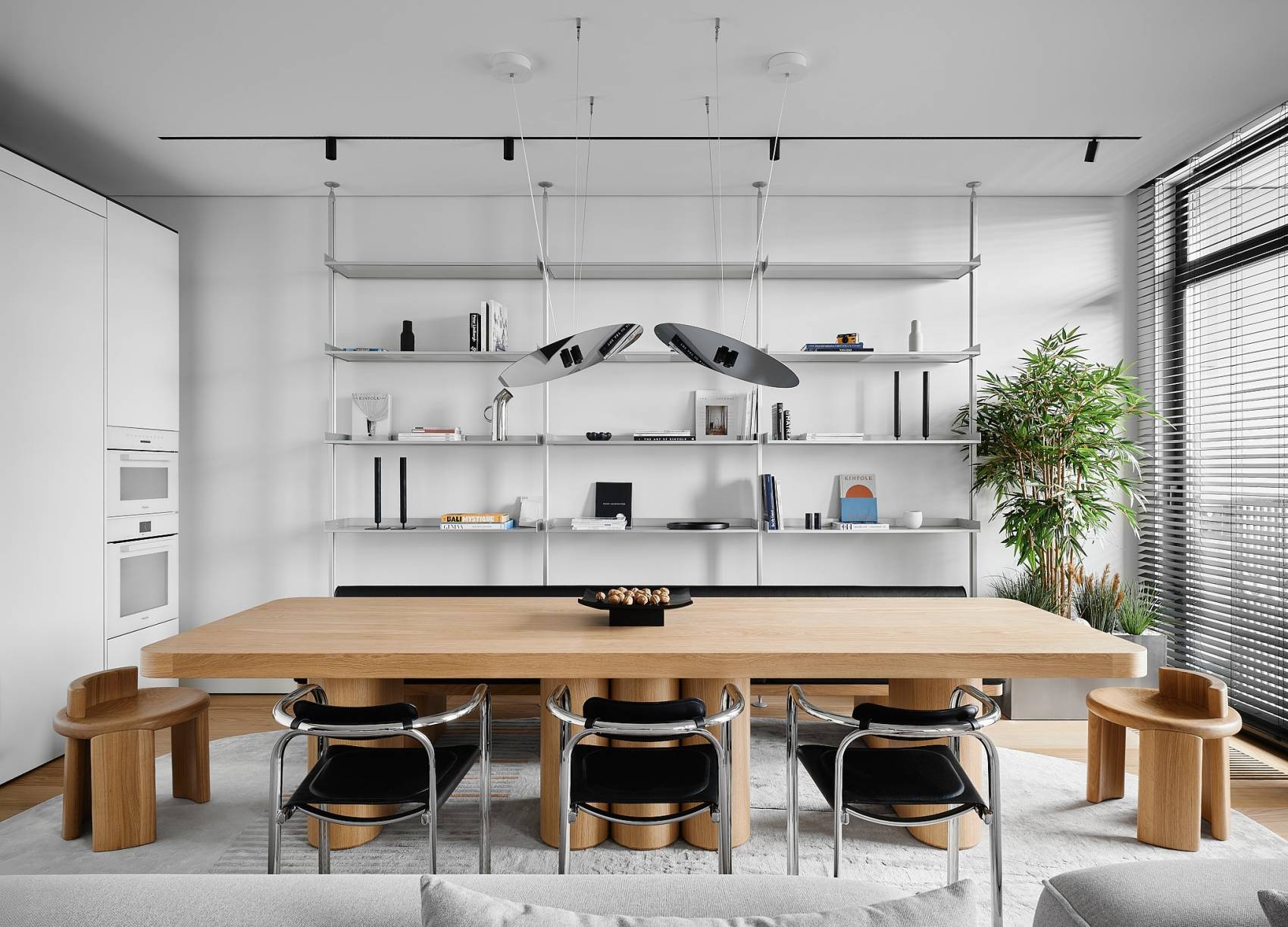 Главным акцентом квартиры, конечно, служит «островок» из тёплого дерева в виде большого обеденного стола, с зелёными деревьями на фоне.