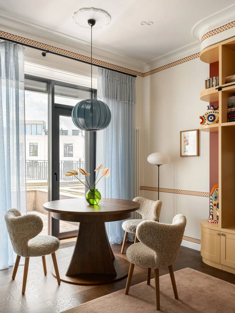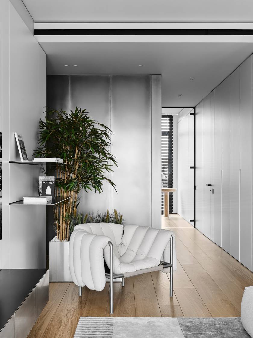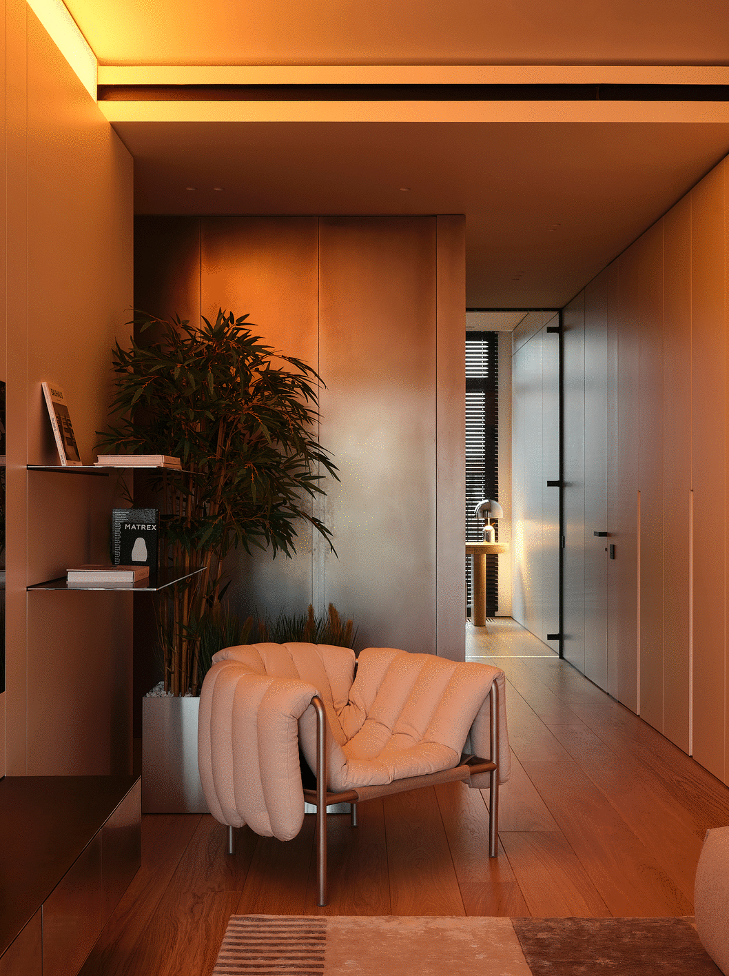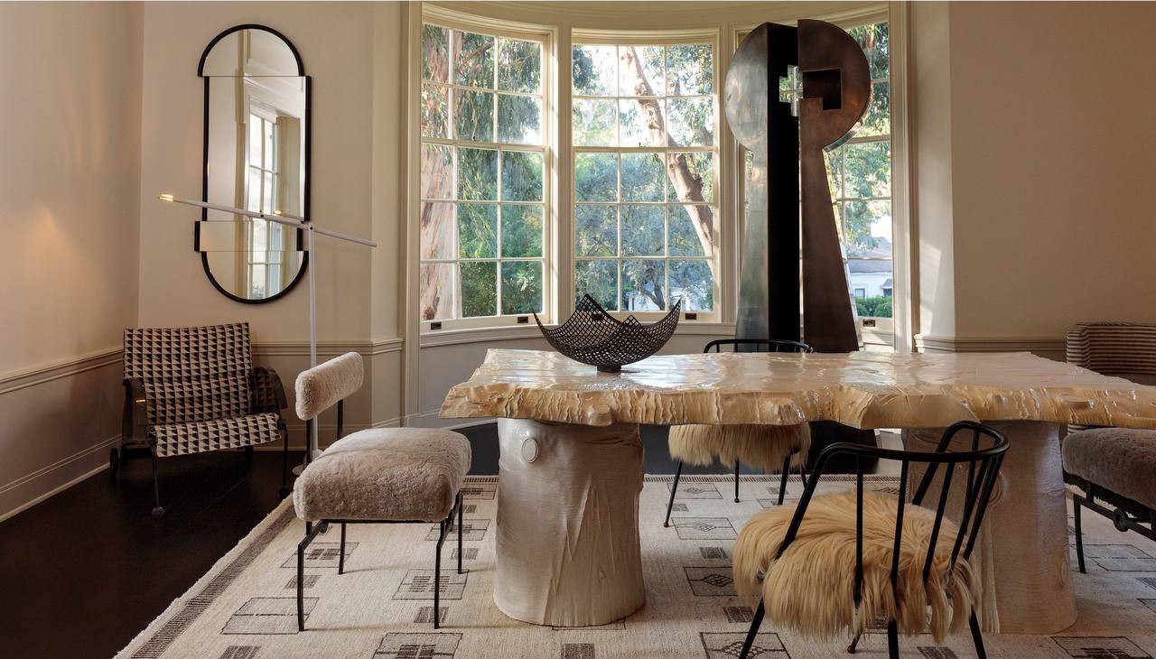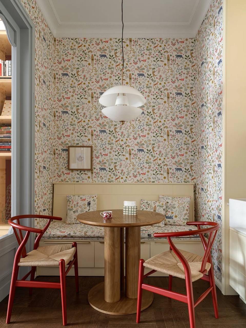 Здесь можно отметить композицию из монохромных стульев, с разной высотой, что добавляет ритмику в пространство. Дизайнер их окутывает тёплыми стенами, ковром, винтажным комодом и конечно же отдельное место здесь занимает скульптура в углу, которыми она любит заполнять пространства. Вообще крупноформатные скульптуры дизайнер называет «лучшими героями» своих проектов, так как они «собирают разноголосицу в единый хор».