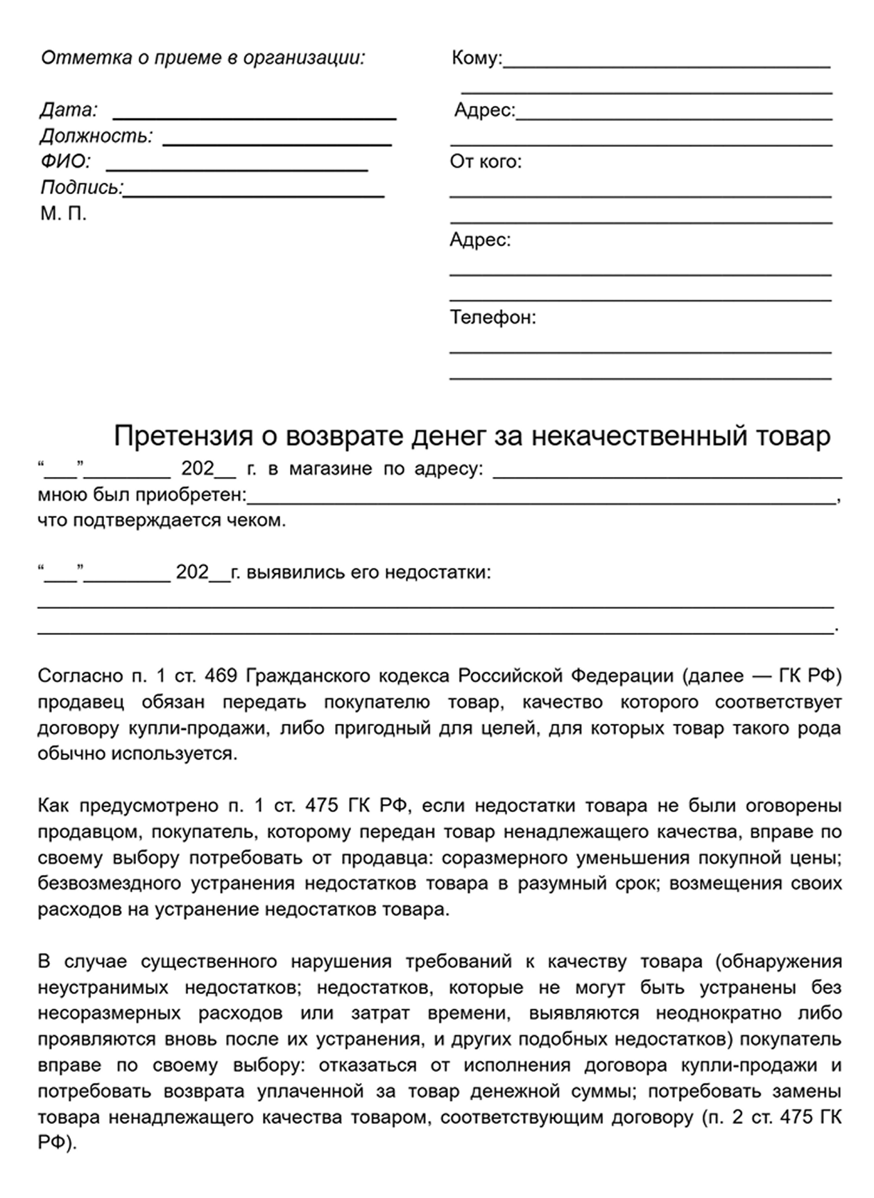 Как лучше поступить. Обращайтесь в магазин сразу — это поможет сберечь время, нервы и деньги. Если магазин отказывается устранять недостатки и возвращать деньги за бракованный товар, подготовьте претензию с вашими требованиями.