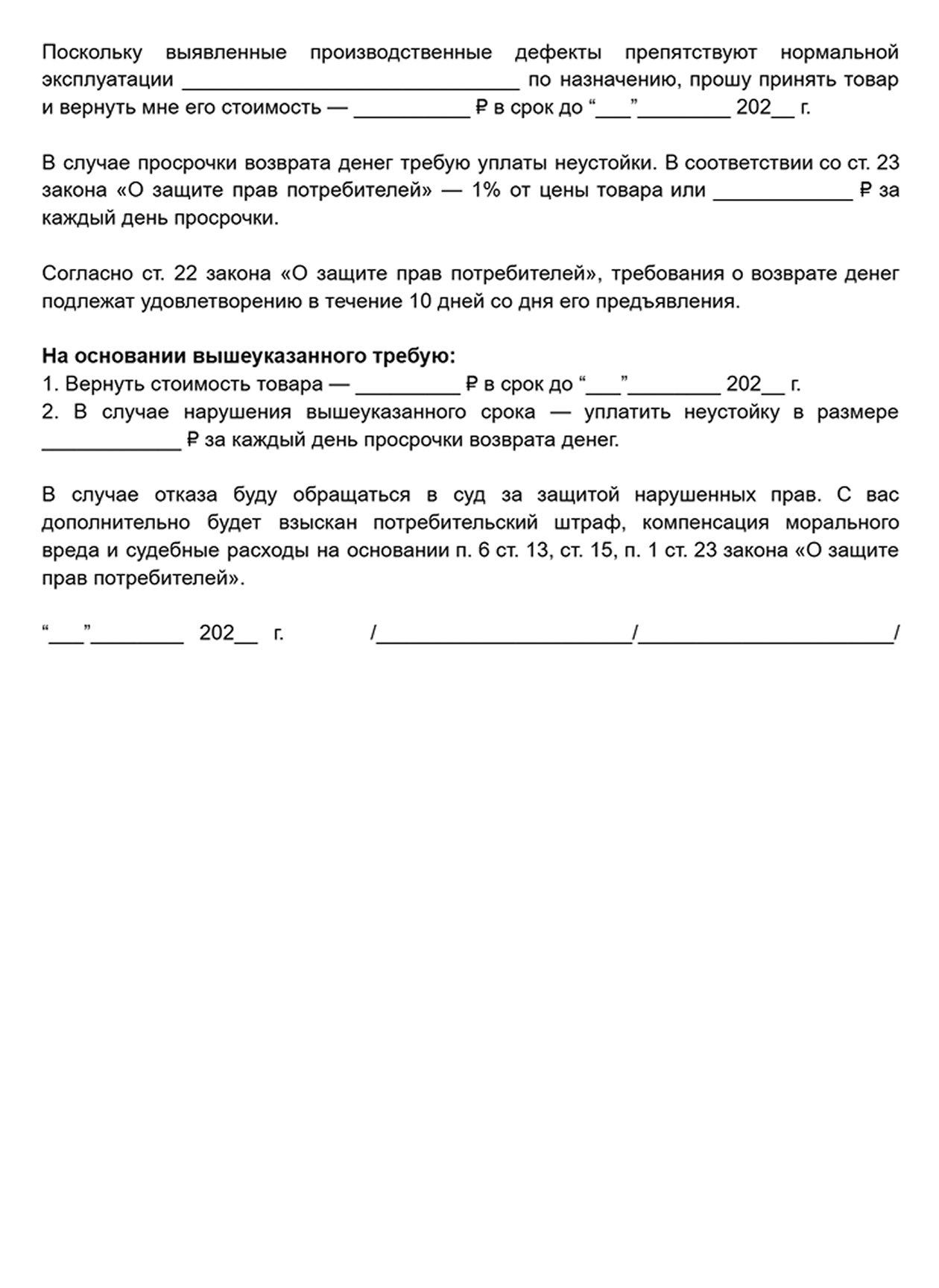 Законодательство предоставляет сильную защиту потребителям — если продавец действительно нарушил закон, за то, что он отказался решить вопрос с покупателем до суда, ему придется заплатить неустойку: 1% от цены товара за каждый день просрочки возврата денег, потребительский штраф и компенсацию морального вреда .