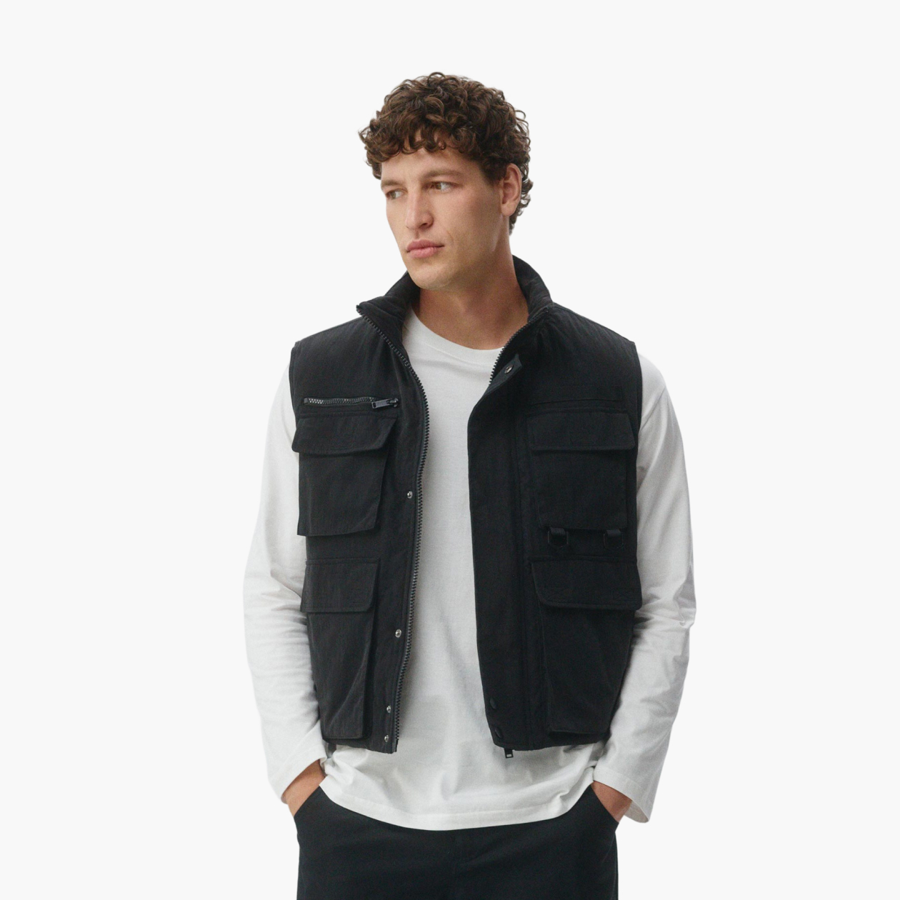 Утилитарные жилеты — в самом актуальном осенью аутдор-стиле — обычно тонкие, легкие и от души усеяны карманами. Такой жилет всегда лучше брать на пару размеров больше, ведь его можно носить поверх куртки и даже пальто.